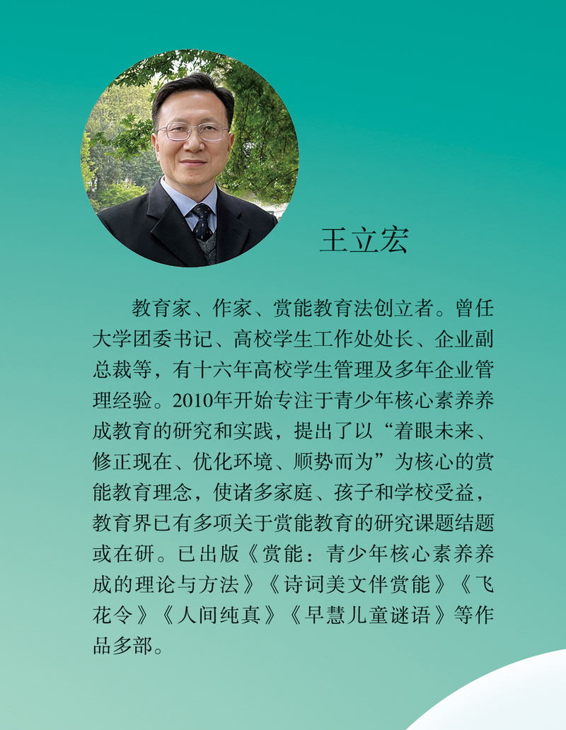 早在2018 年,王立宏就出版了《赏能:青少年核心素养养成的理论与方法》一书,详细阐释了赏能教育的思想理念及研究过程。此后,他又陆续推出《诗词美文伴赏能》《飞花令》(系列)《人间纯真》《早慧儿童谜语》《静待花开(牛一然著)》《天使历险记(王珮璐著)》等适用于不同阶段和场景的配套教材。