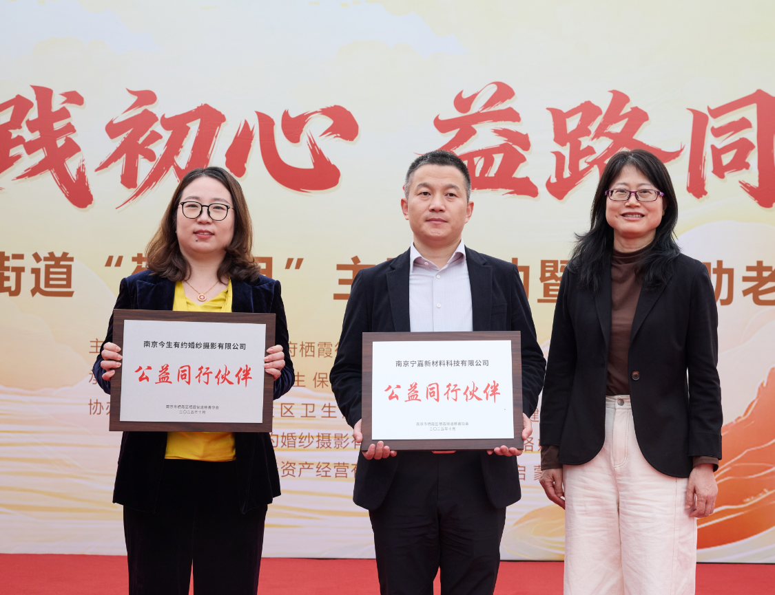 活动还举行了“公益合作伙伴”与“公益助老行爱心企业”授牌仪式。栖霞区民政局、栖霞街道相关负责人分别为践行“暖心助老”的南京今生有约婚纱摄影有限公司、长期资助困难儿童的南京宁嘉新材料科技有限公司授牌;同时为邦基(南京)粮油有限公司、金陵石油化工有限责任公司等10家爱心企业授牌,感谢他们以“红枫般炽热的担当”助力基层慈善公益。