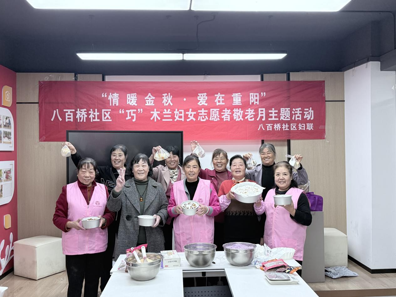 八百桥社区妇联携手新时代文明实践站,组织“巧”木兰妇女志愿者亲手制作饱含心意与祝福的重阳糕,并分组送往高龄和困境老人家中。志愿者们与老人亲切交谈,关切地询问他们的身体与生活状况,将节日的问候与社区的温暖一同送达。这份手工制作的礼物,承载着深深的敬意与关怀,老人们接过糕点时脸上洋溢的笑容,成为秋日里最动人的风景。