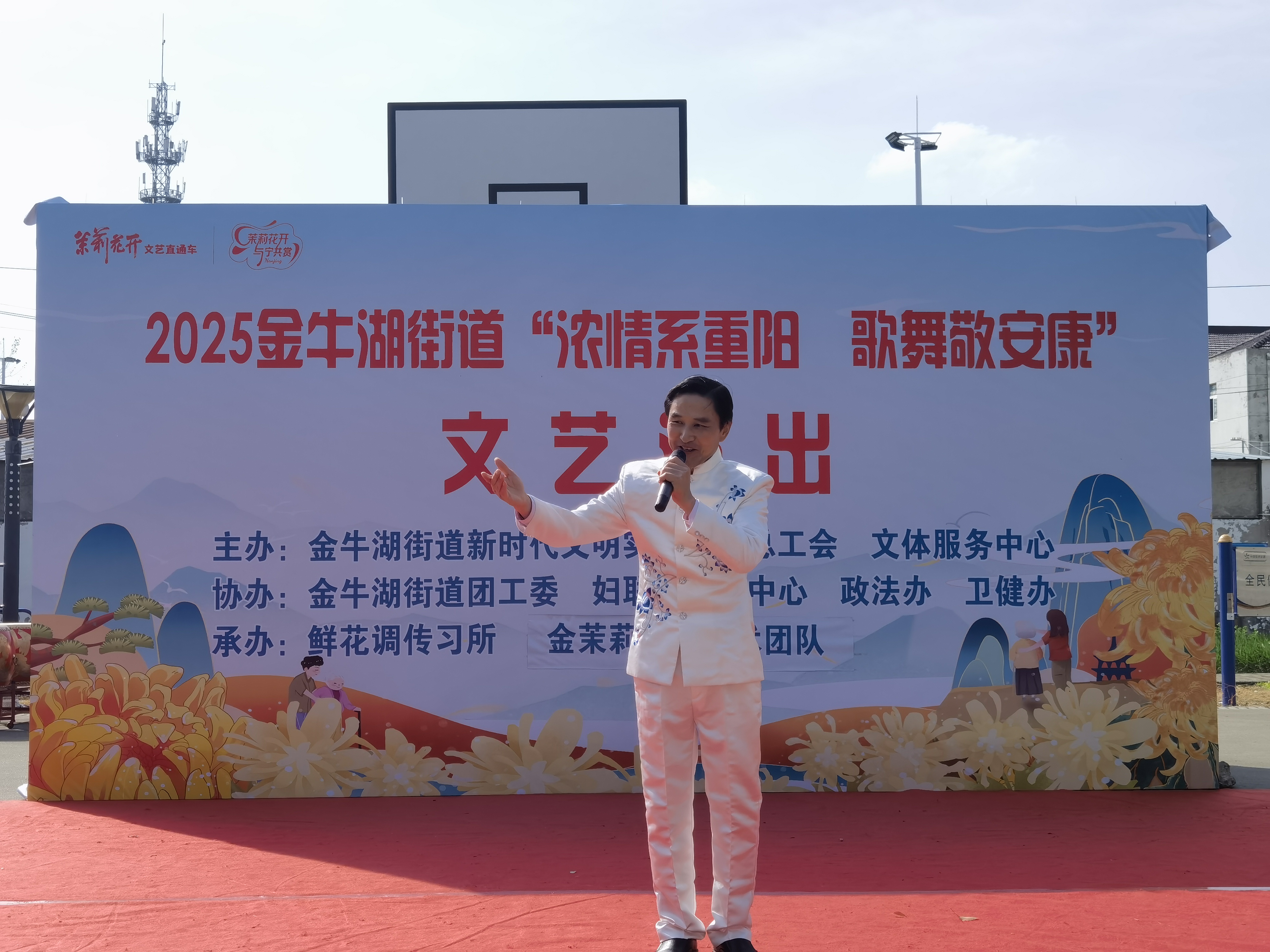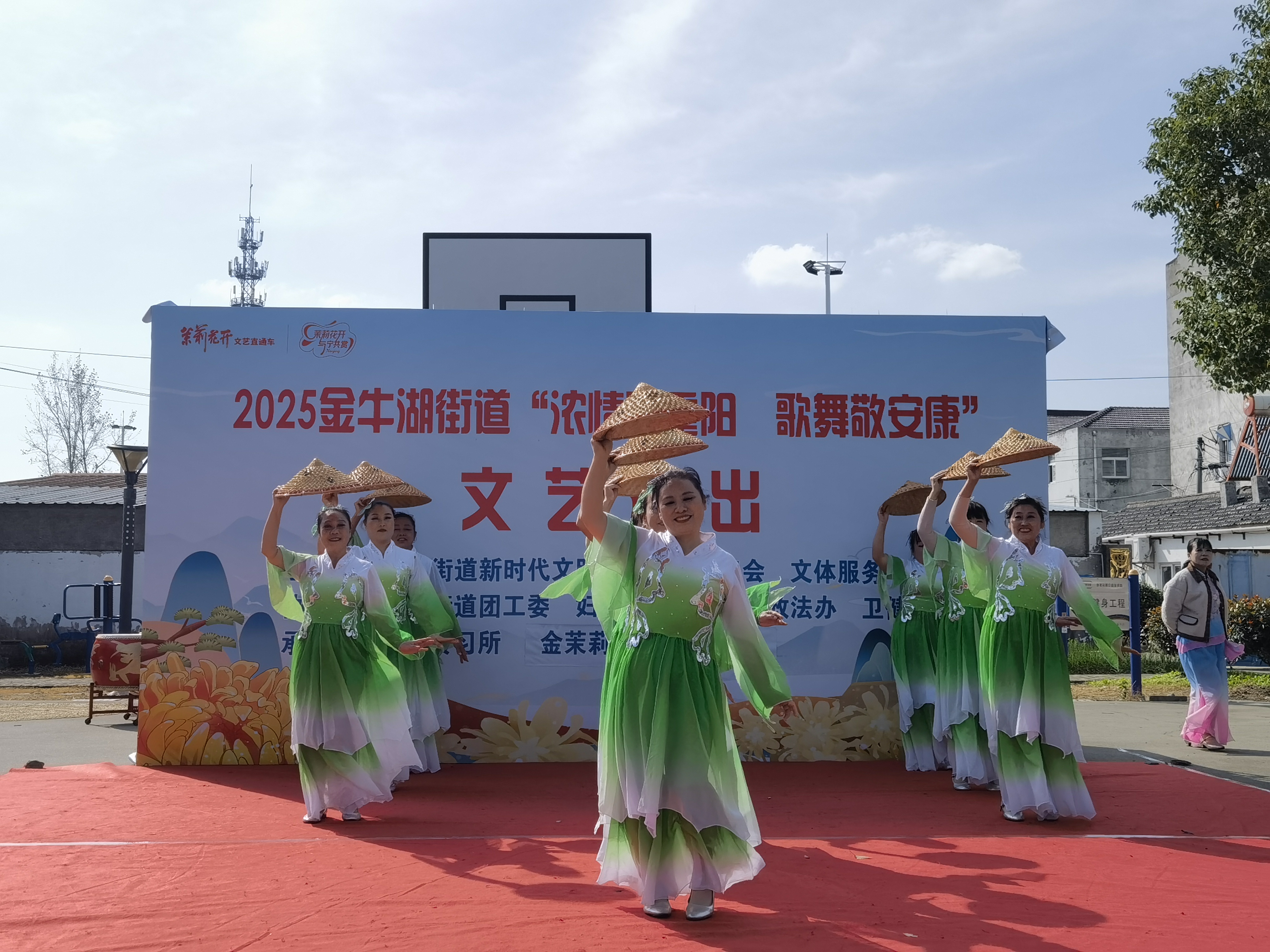 由金牛湖街道新时代文明实践所、金牛湖街道总工会、文体服务中心主办,在金山村与八百桥社区同步开展的“浓情系重阳 歌舞敬安康”文艺演出中,鲜花调传习所献上扬剧《向朝阳》,唱腔动人;歌伴舞《你是我心中的茉莉花》巧妙融入茉莉花意象,以花寓情,呼应品牌主题,传递出细腻温暖的情感表达。金茉莉文化艺术团队则通过斗笠舞《绿水青山》,以灵动舞姿展现山水韵律与农耕文化,传递出人与自然和谐共生的美好愿景;歌伴舞《搀扶》则以“搀扶”为意象,艺术化地呈现了从青春到白首的不变陪伴,引发观众对亲情与陪伴的深切共鸣。整场演出不仅丰富了老年人的精神文化生活,也进一步推动了“茉莉花开”文化品牌在基层的落地与传播。