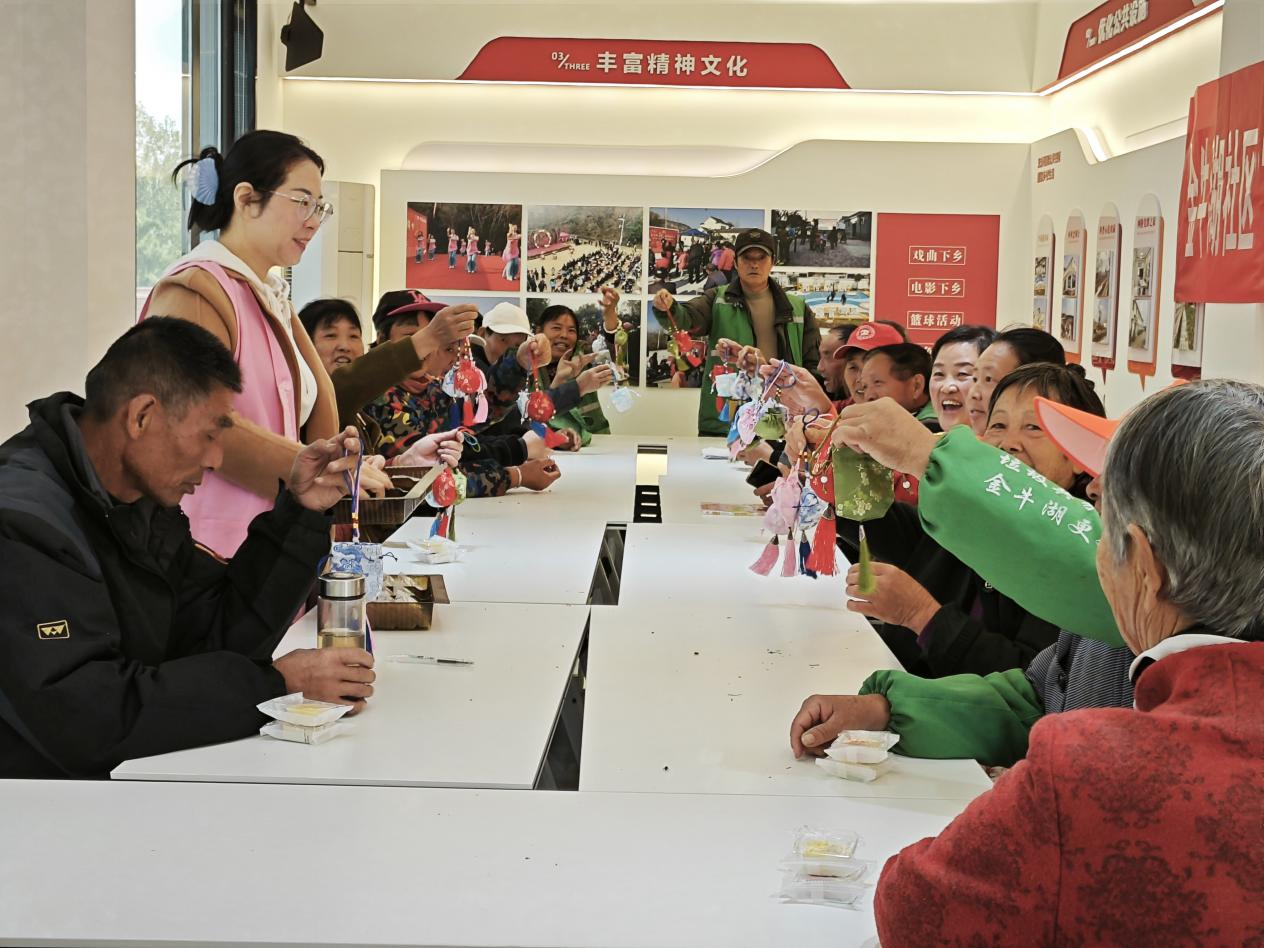 书香浸润时光,民俗传递深情。金牛湖社区山子林会客厅内,“民俗里的重阳·传统与阅读同行”故事会温情启幕。志愿者与居民们共同重温重阳节的故事与古老习俗,在共读中唤醒集体记忆,感受根植于血脉的孝道亲情。紧接着的巧制茱萸香囊环节,大家将对长辈的关爱与祝福密密缝入其中,让“萸囊寄孝”的古老传统焕发出新的情感温度。活动尾声,大家围坐品尝象征“百事俱高”美好祈愿的重阳糕,畅聊家常,会客厅里弥漫着糕点的香甜与浓浓的邻里情谊。
