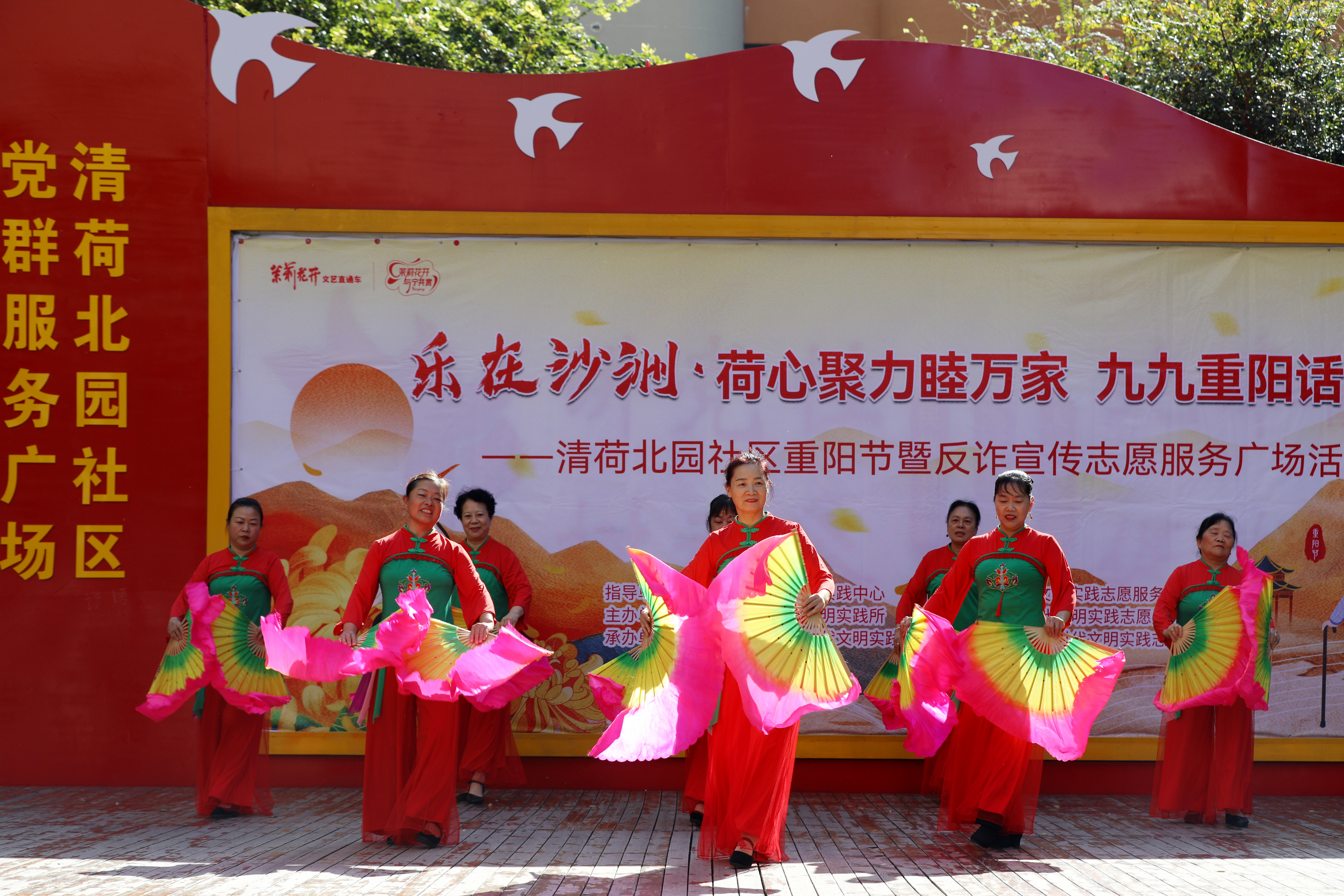 文化氛围的“现代场景营造”。传统重阳的“欢乐”多局限于家庭聚会,清荷北园社区则通过“群众化文艺汇演”构建社区公共欢乐场景。与传统戏曲表演不同,汇演内容兼顾“传统韵味”与“现代喜好”——民乐合奏《九九艳阳天》保留传统旋律,广场舞《故乡的情》、扇子舞《珊瑚颂》贴合老年群体日常娱乐习惯,情景剧《老两口学毛选》以生活化表演复刻时代记忆,《歌曲三连跳》则用节奏明快的现代舞蹈形式激活情感共鸣。这种“传统曲目+现代载体”的组合,让老年群体在熟悉的文化符号中感受节日氛围,同时拉近邻里距离,实现“传统节日”到“社区文化纽带”的转化。