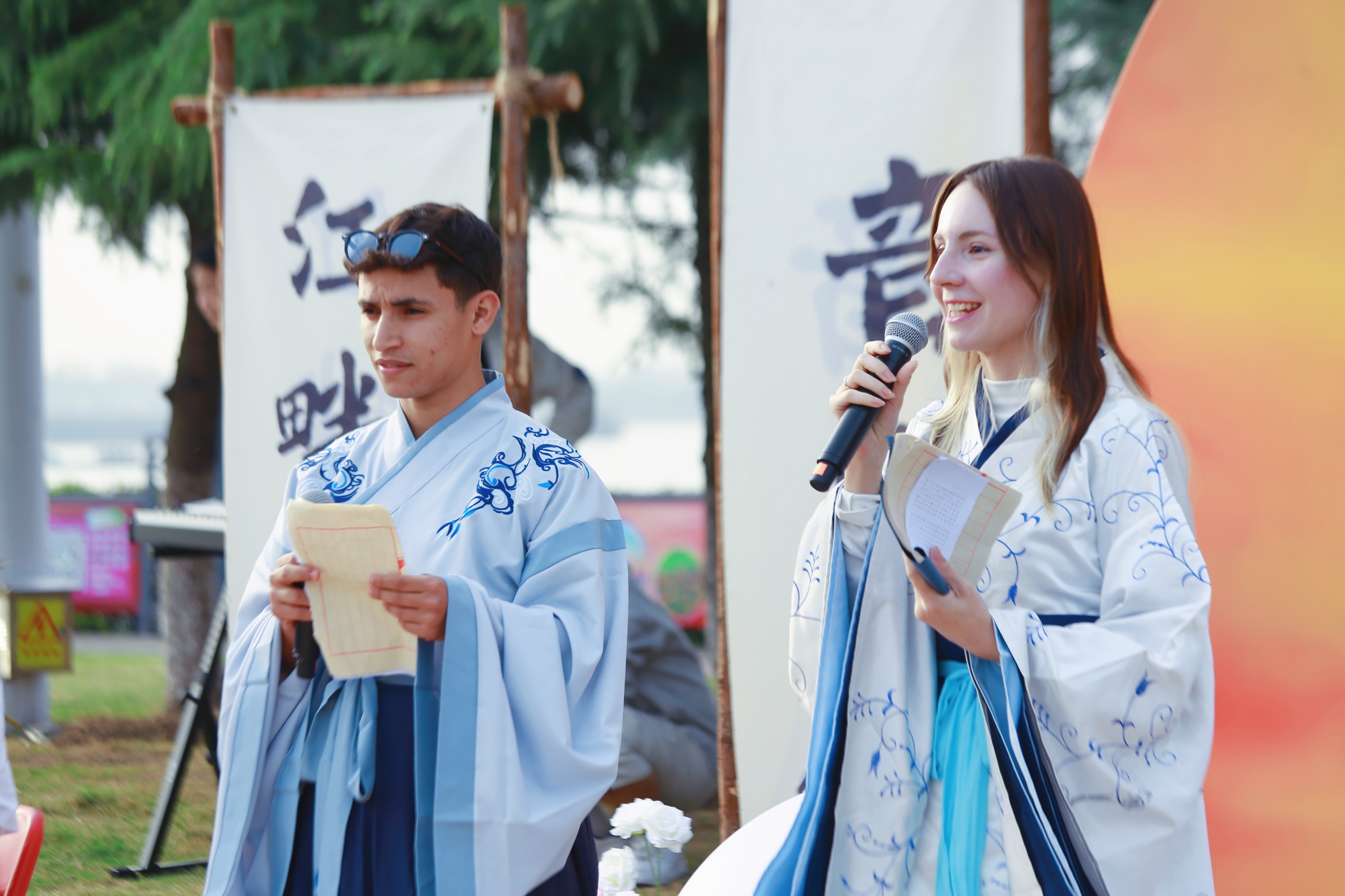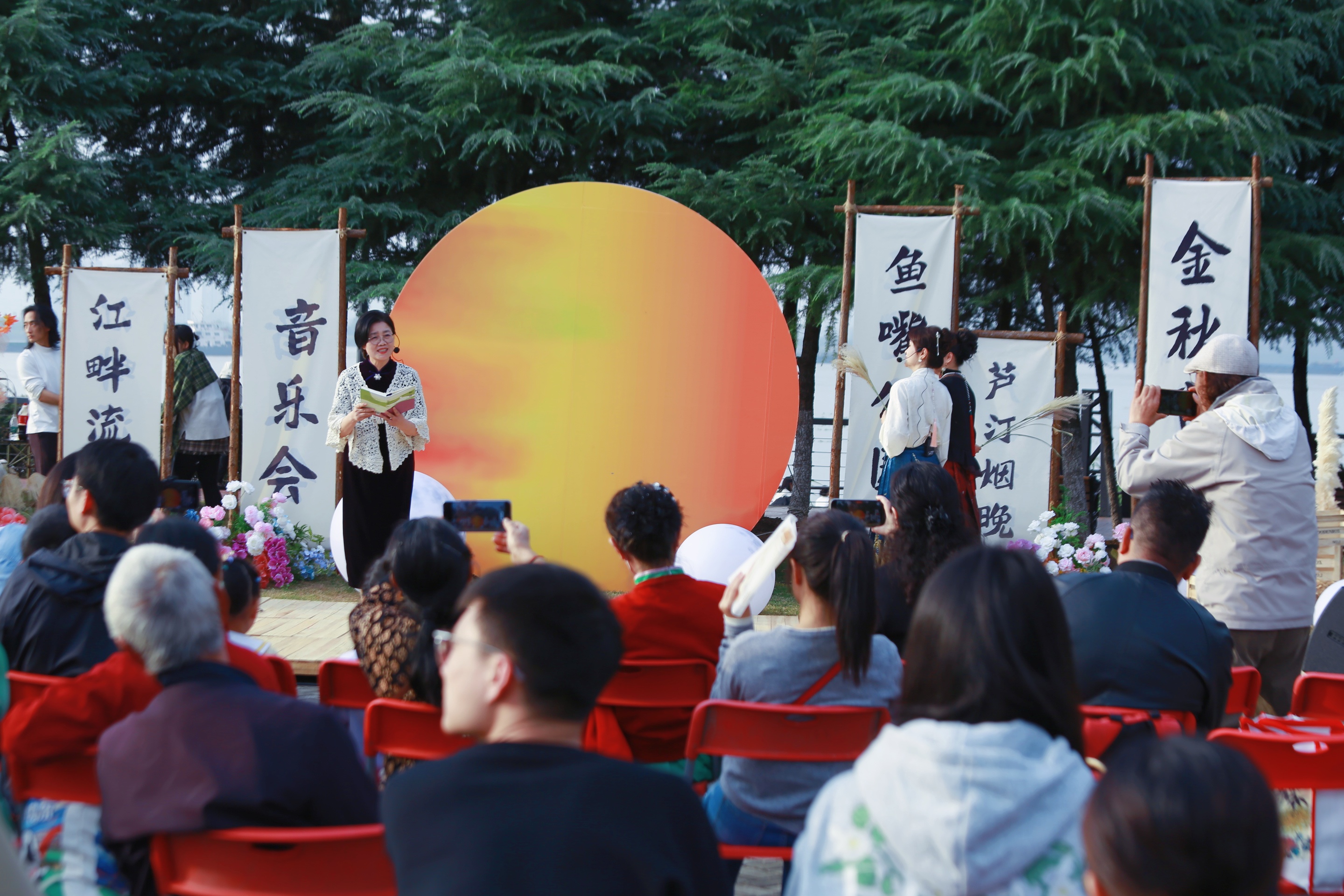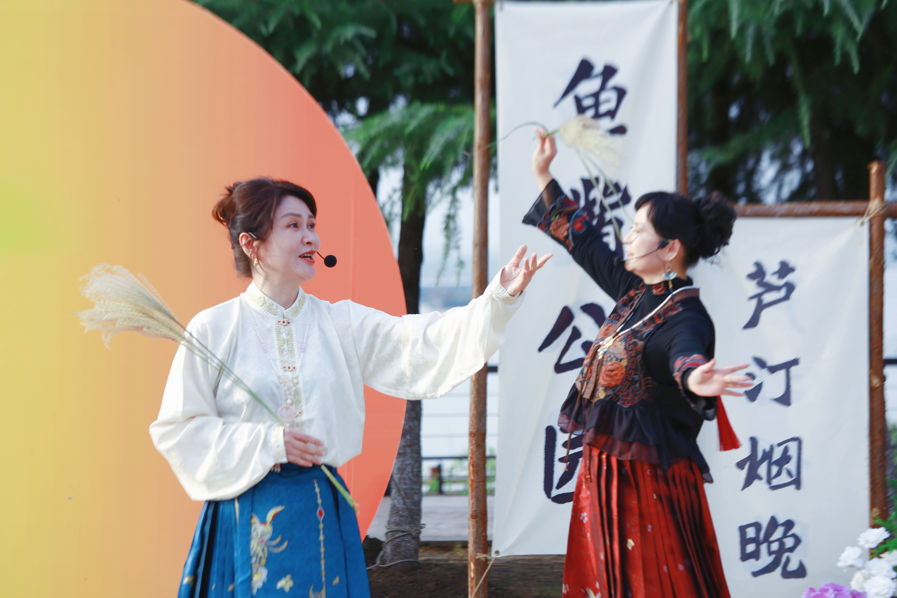 活动在双排键独奏《在希望的田野上》的悠扬旋律中拉开帷幕。随后,江苏广电主持人天团带来的团体朗诵《读中国》,以声音回溯千年文脉;国潮器乐串烧《茉莉花》《拔根芦苇花》《护花使者》则创新演绎传统韵律,焕发时代生机;中国播音主持“金话筒奖”得主姜林杉朗诵的《芦花荡》,于细腻声线中尽显芦花的坚韧与温柔。此外,非遗《川剧变脸》、歌伴舞《芦花》、跨界器乐《姜花》以及国际友人参与的《蒹葭》朗诵与古琴演奏等节目接连上演,精彩纷呈,最后由南京风吟朗诵艺术团带来的《芦花如雪飘古今》为演出画上圆满句号,实现了古今对话与中外文化交流。