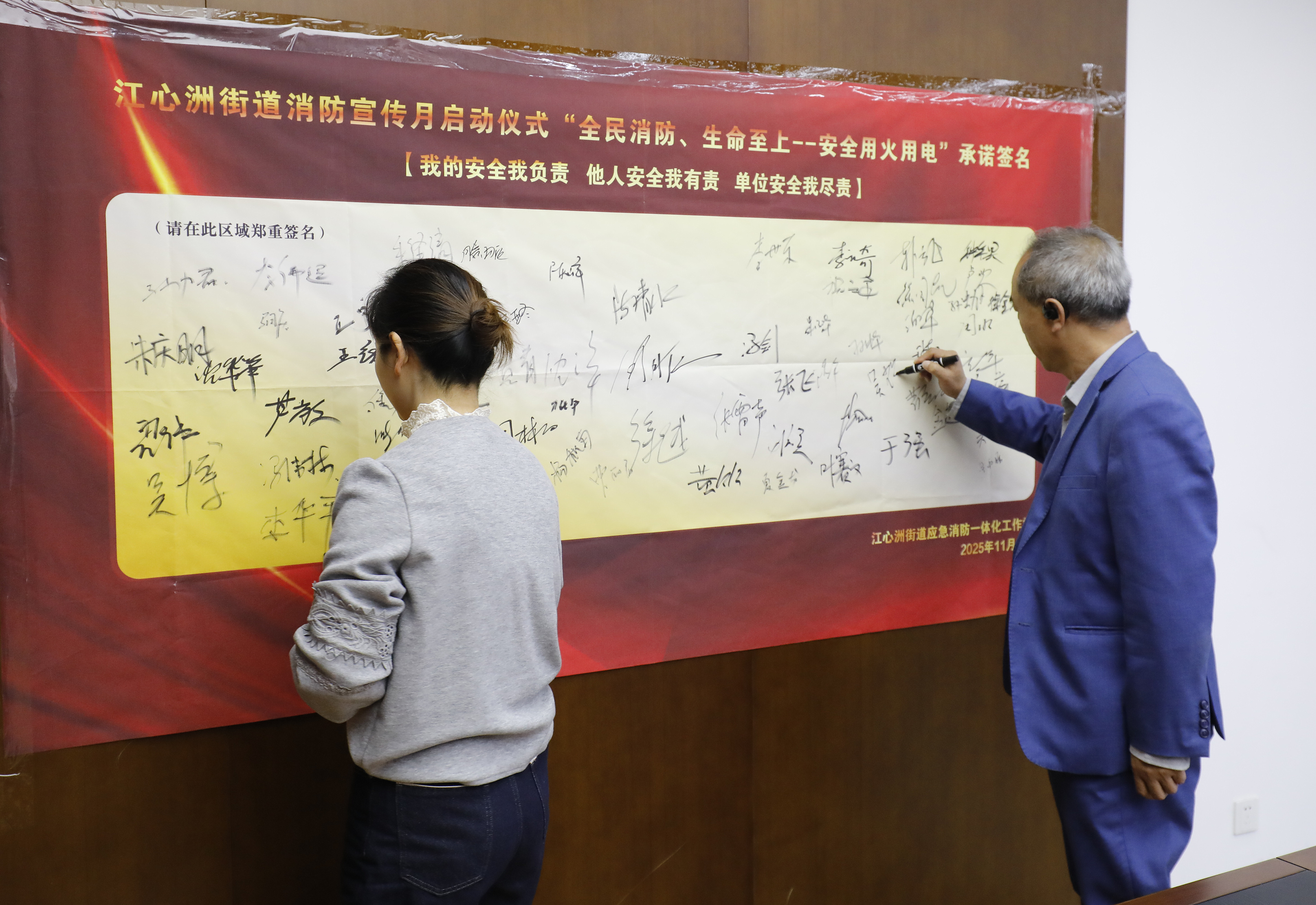 随后,街道分管领导为消防宣传月揭幕,标志着“九个一”系列宣传活动正式启动。全体参会人员有序在“我的安全我负责、他人安全我有责、单位安全我尽责”的承诺签名板上郑重签名,许下消防安全庄严承诺。