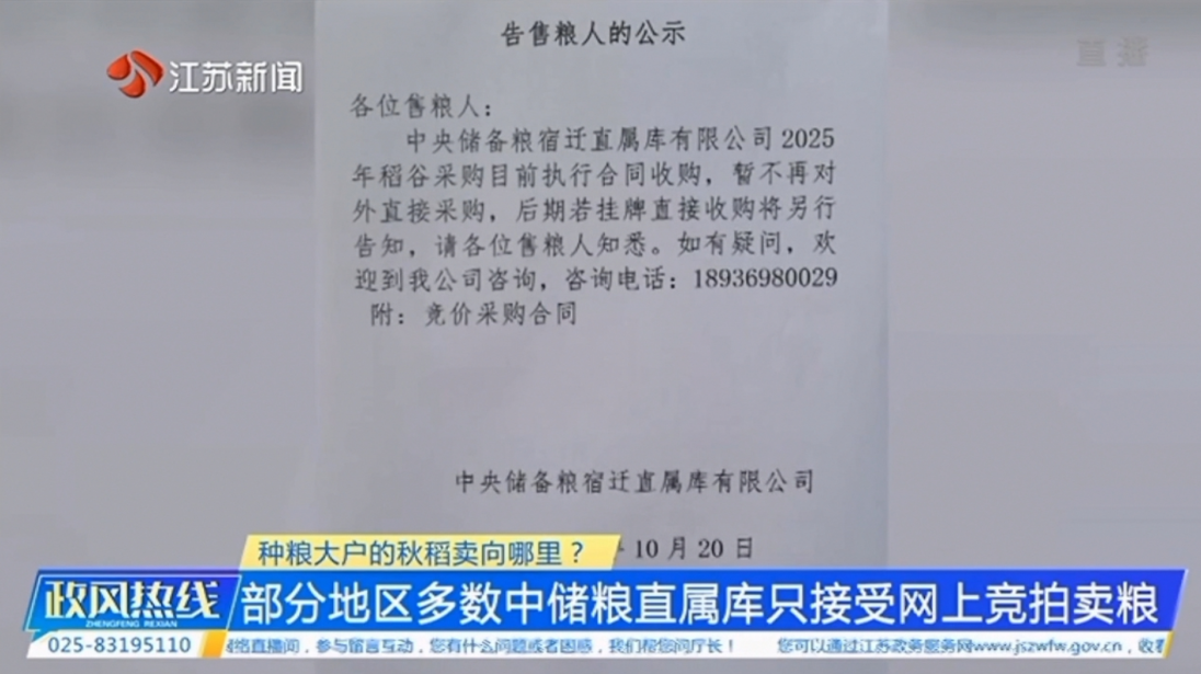 眼下正值秋收关键期,江苏多地种粮大户却遭遇“卖粮难”困境。近日,“政风热线”全媒体直播节目通过记者走访调查,揭露了秋粮收购中的突出问题:种粮大户反映,往年若价格不合适、不想卖给粮食经纪人,只要把粮食含水量烘干至14.5%以内,联系周边粮库收粮,价格能卖得更高;但今年即便粮食含水量等指标达标,也很难找到可收购粮食的粮库。