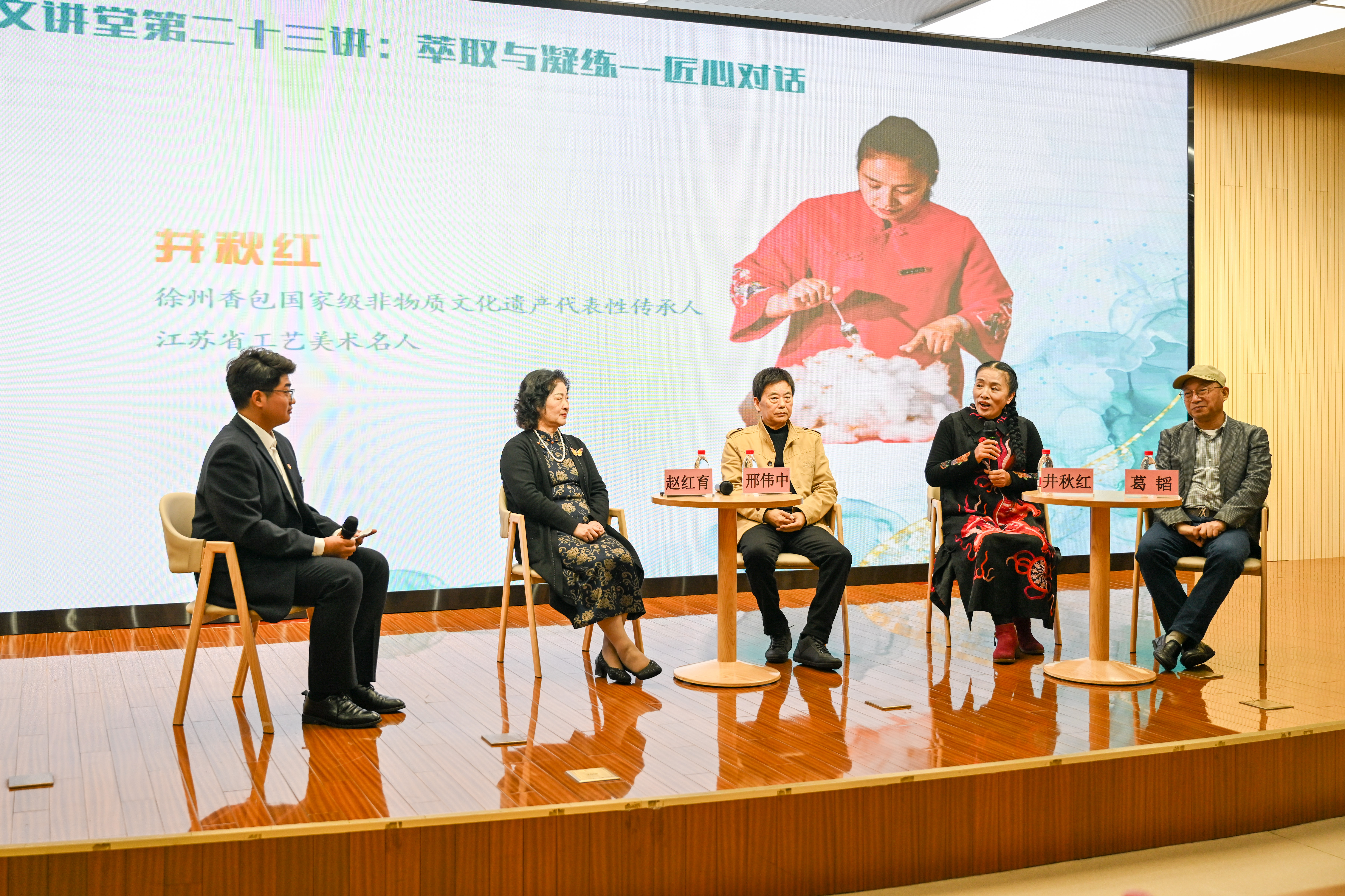 除了热闹的展示体验区,下午在图书馆博文报告厅举行的“萃取与凝练:匠心对话”微访谈同样精彩。徐州香包传承人井秋红、苏绣(精微绣)传承人赵红育等四位业界大咖与师生代表面对面,围绕“非遗传承的当代挑战与创新路径”“非遗与高校文化育人的双向奔赴”等议题展开深入交流,为青年学子解读非遗传承的密码。