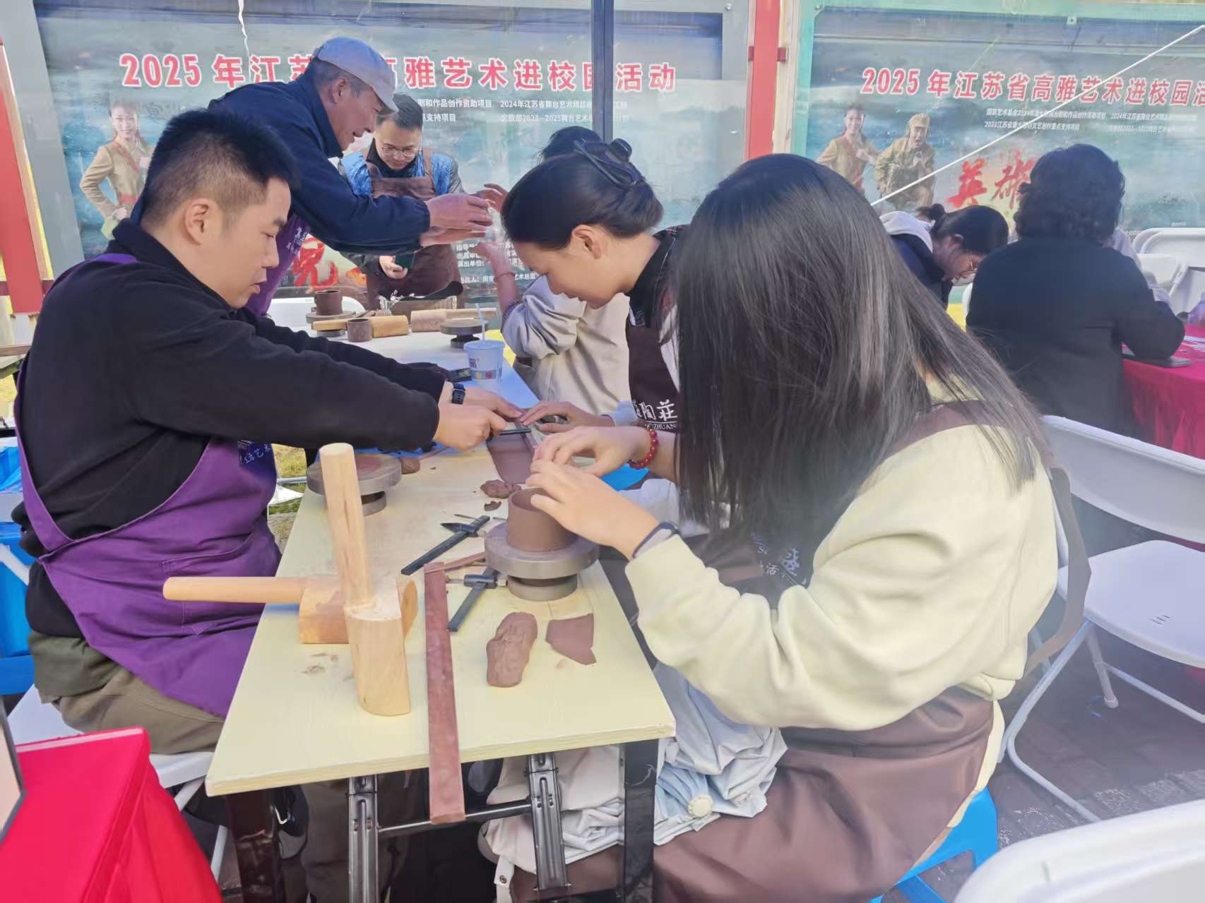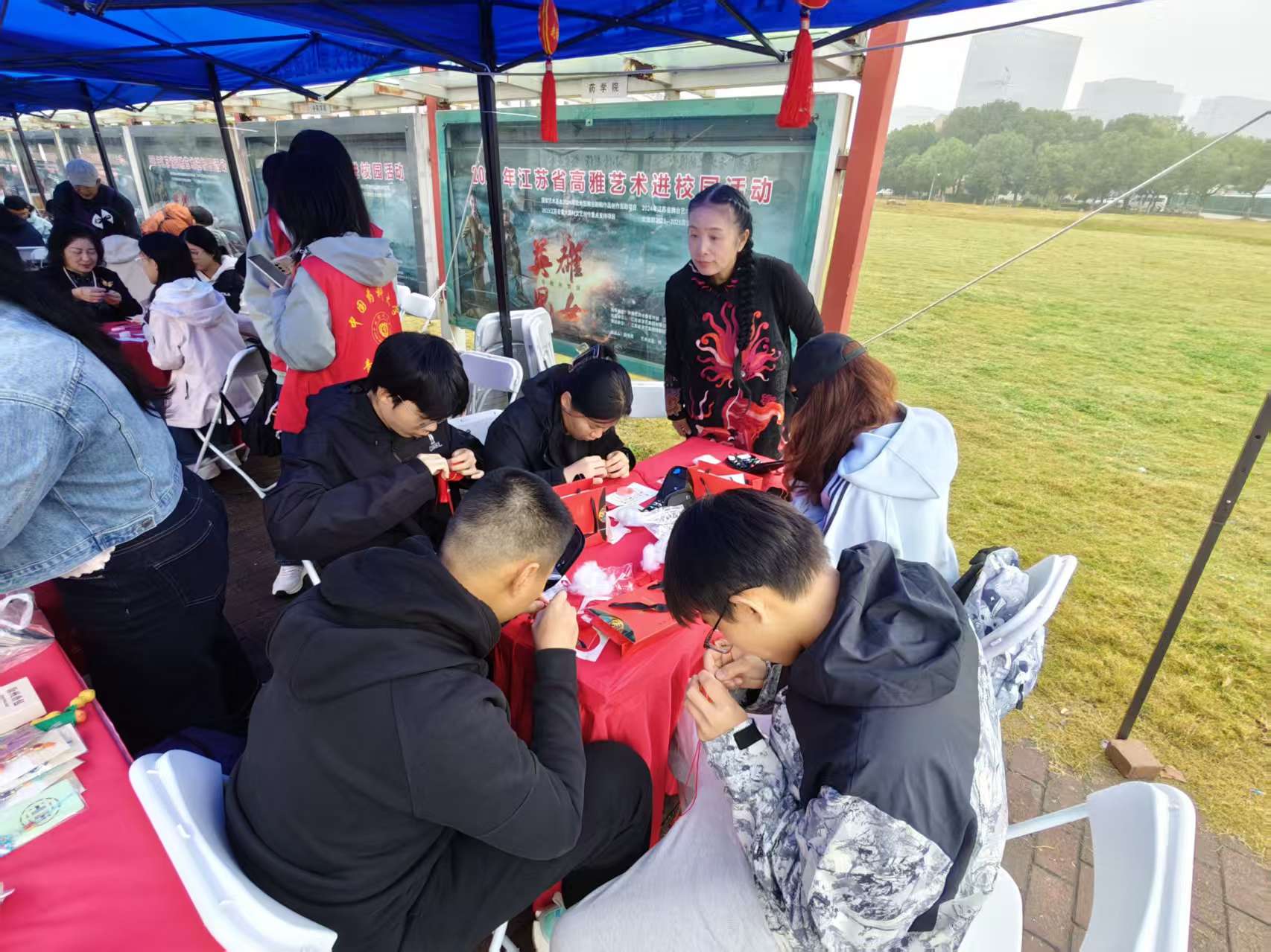 每个展位旁的体验区都座无虚席,同学们在传承人的手把手指导下,兴致勃勃地参与手工制作。穿针引线学苏绣、揉捏陶土做紫砂、飞针走线绣香包、勾勒线条刻竹片,大家都很专注投入,不时有同学举起刚完成的作品相互展示,脸上洋溢着满满的成就感。