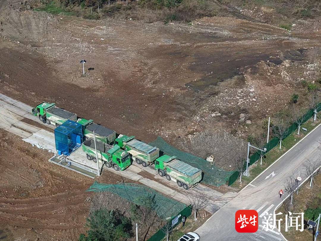 11月10日,扬子晚报/紫牛新闻记者前往实地探访发现,枫叶大道旁的一处施工场地入口处,车辆进出频繁,满载渣土的卡车裹挟着泥土往返不息,路面上残留着被碾压后的泥块,车辆驶过便扬起阵阵尘土,与周边火红的枫叶景观格格不入。现场张贴的告示显示,此处为由六合区城市管理局批复的“竹镇镇烟墩社区季山组洼地建设项目”,回填土方量约5.5万立方,建设单位为南京市六合区竹镇新市镇建设投资有限公司。