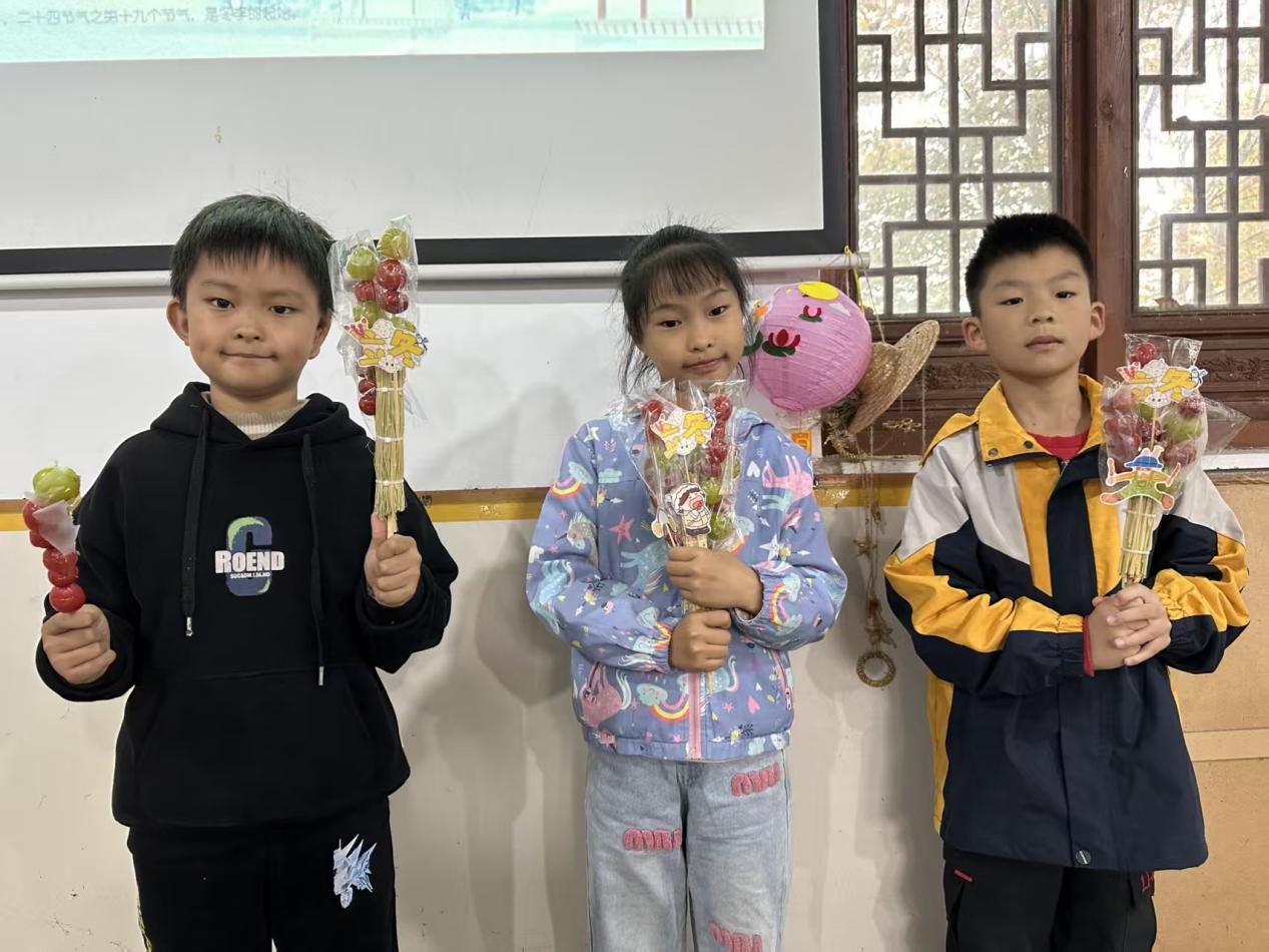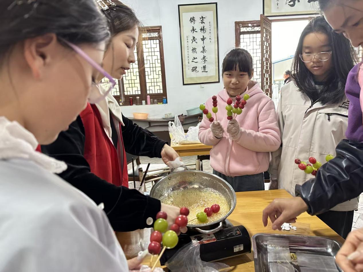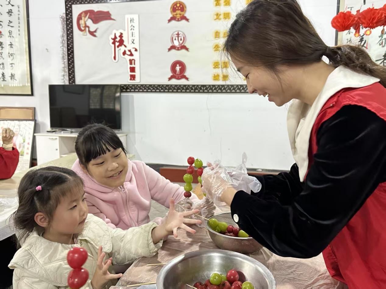 在制作过程中,大家相互交流经验,分享技巧,欢声笑语回荡在整个场地。孩子们也兴奋地参与其中,在志愿者和家长的帮助下,小心翼翼地将水果串在竹签上,再裹上一层香甜的糖稀,一个个充满童趣的长糖葫芦便诞生了。