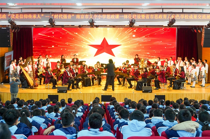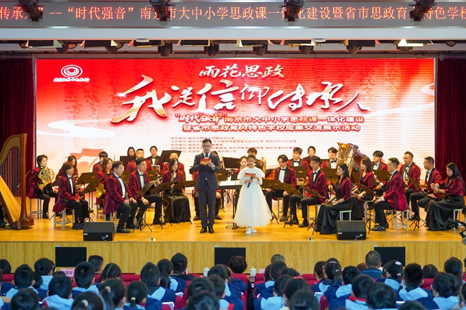“交响铿锵,红旗飘扬!”11月18日上午,南京市文靖东路小学内,江苏东方交响管乐团演奏的《红旗颂》拉开了雨花思政“我是信仰传承人”——“时代强音”南京市大中小学思政课一体化建设暨省市思政育人特色学校成果交流展示活动的序幕。激昂的旋律将现场观众带回热血年代,也奏响了这场“思政+音乐”特色育人盛会的序曲。