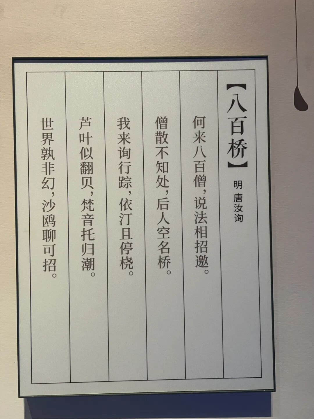 “何来八百僧,说法相招邀。僧散不知处,后人空名桥。”展厅一隅,明代诗人唐汝询的《八百桥》静静陈列。诗中的八百桥,如今仍是金牛湖街道的标志性地名,站在文字前,仿佛能看见诗人当年“依汀且停桡”的身影,芦叶如翻贝,潮声载梵音,那份对世事变幻的淡然,随着诗句穿越百年,与今日金牛湖的静谧相得益彰。