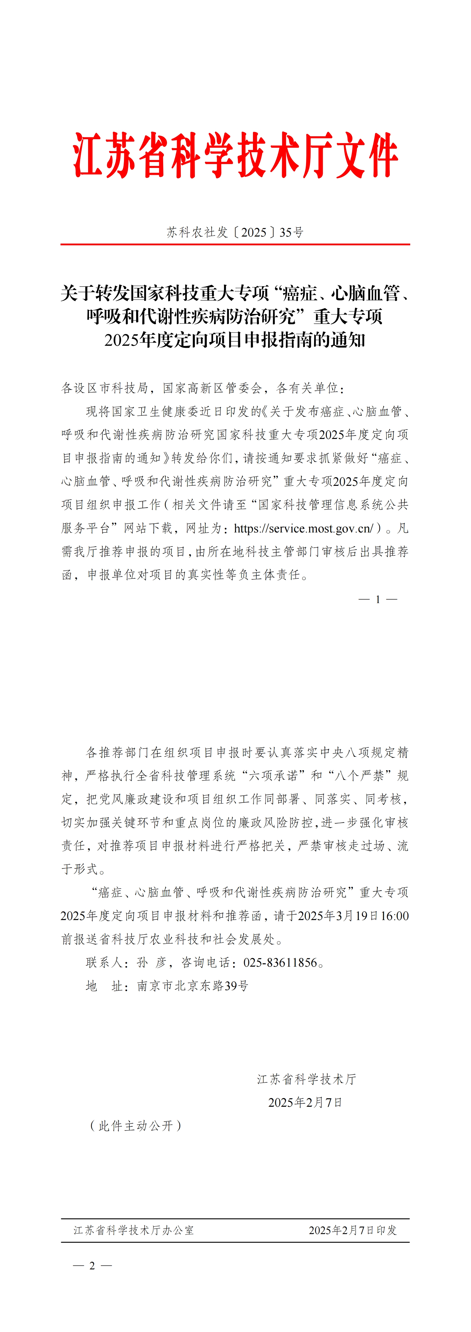 关于转发国家科技重大专项“癌症、心脑血管、呼吸和代谢性疾病防治研究”重大专项2025年度定向项目申报指南的通知