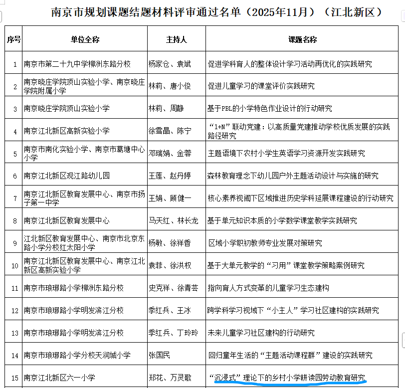 勤耕不懈,再次喜摘硕果。历经三年潜心钻研,南京江北新区六一小学的市级十四五规划课题《“沉浸式”理论下的乡村小学耕读园劳动教育研究》顺利通过专家评审,圆满结题。课题的成功结题,标志着学校在劳动教育领域的探索与实践取得阶段性重大成果,为学校校本特色发展再添新动能。