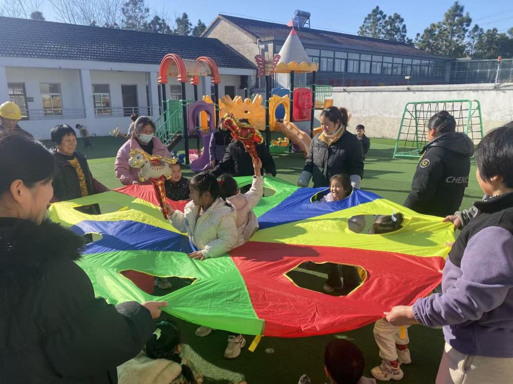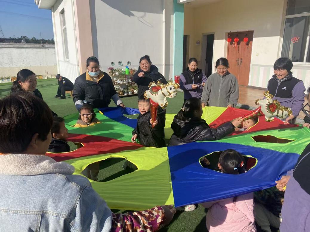 活动当天,志愿者和老师们精心布置活动场地,小朋友欢聚一堂,五彩斑斓的气球悬在半空,红底金字的“元旦快乐”格外醒目,老师为小朋友们发放节日道具,整个空间洋溢着浓浓的节日气息。随着活动正式开始,家长志愿者与老师一同拉起色彩斑斓的彩虹伞,孩子们或化身灵活的“小地鼠”从伞洞探出头,或手持节日彩棒扮演“打地鼠小能手”,软棒轻挥、身影躲闪,操场瞬间变成了童趣满满的欢乐场。孩子们脸上都洋溢着兴奋的笑容,像一朵朵盛开的民族团结之花。