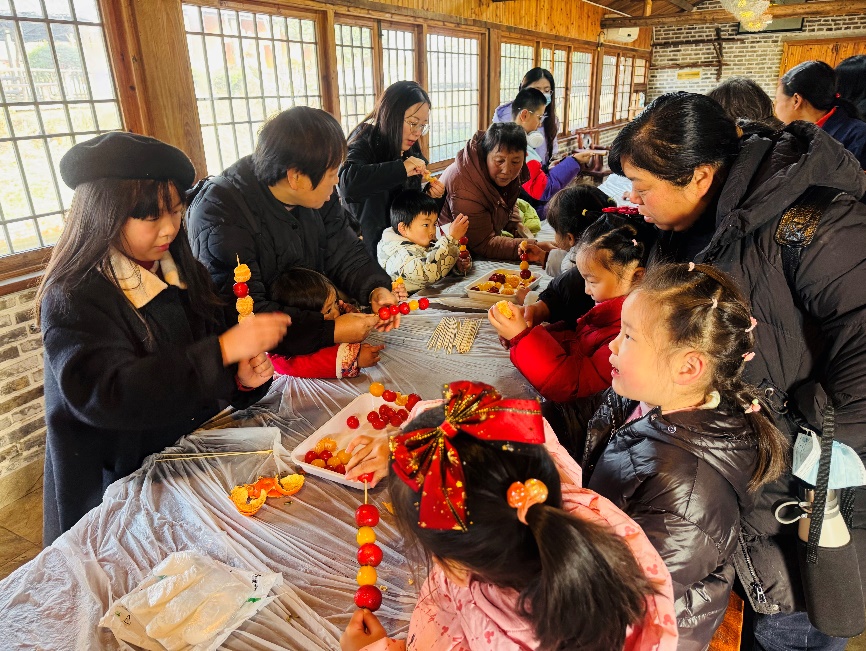 文化探秘过后,甜蜜十足的冰糖葫芦制作环节温馨开启。志愿者提前备齐新鲜山楂、竹签、冰糖等材料,细致演示食材清洗、去核、穿串、熬糖、裹糖的完整流程,重点讲解熬糖“火候适中、不搅拌防起砂”的关键技巧。亲子们分工协作,家长帮忙处理山楂,孩子动手穿串,共同等待糖浆熬至金黄黏稠。当一串串裹满晶莹糖衣的糖葫芦冷却成型,咬上一口“咔嚓”作响,酸甜滋味在口中蔓延,成为冬日里最暖心的甜蜜记忆。