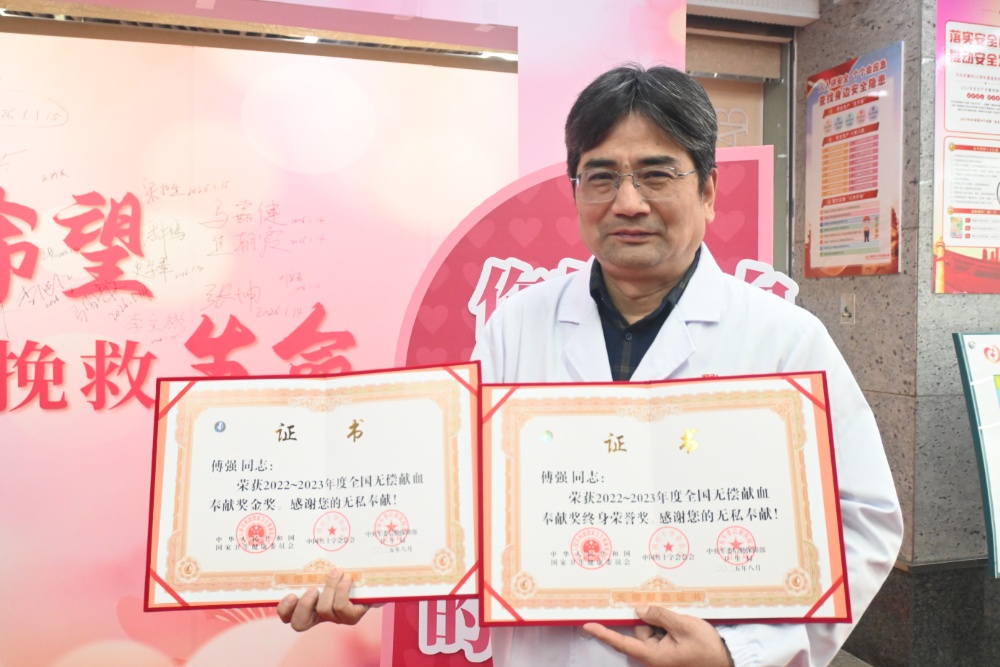 “用可再生的血液,挽救不可重来的生命。”这句深植于每位血液中心工作人员心中的信念,在傅强身上得到了生动体现。医学出身的他,曾是一名外科医生,比常人更懂得血液对患者的重要性。自1998年入职血液中心以来,傅强深深体会到这份工作的分量,从1999年起便持续参与无偿献血,至今已献血77次,总量达27000多毫升,相当于6名成年人的全身血量,为危重患者送去希望。凭借这份坚持,他曾三次获得全国无偿献血奉献奖金奖,今年更荣获终身荣誉奖。