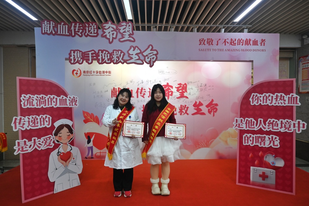 表彰现场,一个个温暖瞬间被定格为佳话。29位受表彰者中,有母爱传承的“母女档”,血源科的张嵘嵘和就读于南京特殊教育师范学院研一的女儿林芝,此次同时荣获奉献奖铜奖。女儿从18岁起便主动参与献血,母女俩用并肩的坚持,完成了一场爱心的接力。血源科副科长浦磊与机采科护士王丽这对模范夫妻,始终以行动为同事们树立着榜样。