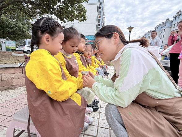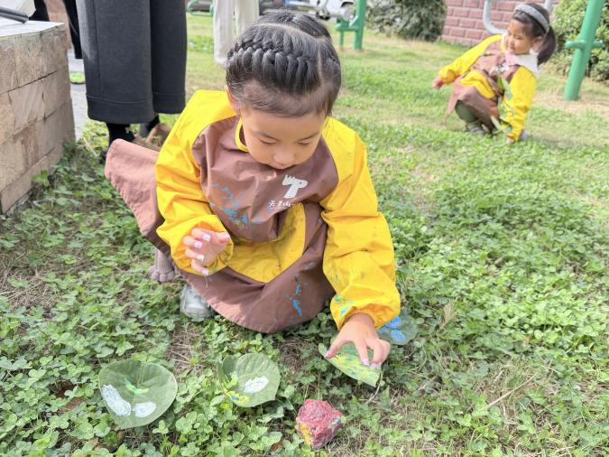 “我要把石头画成小太阳,让花坛边天天有阳光!”“我们用树叶贴一只蝴蝶,飞到围栏上好不好?”孩子们围坐在一起,时而专注地给石头涂画,时而默契地搭配树叶装饰画,小画笔在家长的协助下变成“创意工具”,颜料在小手上绽放出缤纷色彩。原本普通的自然材料,在孩子们的奇思妙想中,变成了憨态可掬的石头小动物、灵动的树叶装饰画,每一件作品都充满了童真与活力。