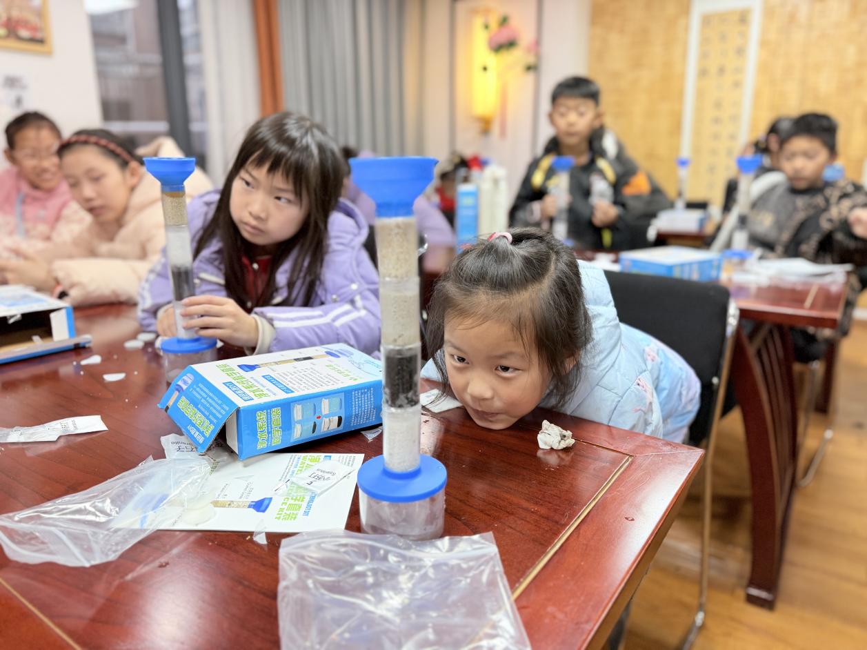 从科技馆返程后,净水实验课堂如期开展。科普老师以模拟污水为切入点,拆解沉淀、过滤、吸附等核心原理,分步演示实验装置组装要点,随后为孩子们分发专属材料包。老师细致指导大家记录实验、观察水质蜕变,并鼓励亲子共研巩固成果,搭建起“场馆认知+家庭延伸”的学习闭环。青少年们全情投入、亲手调试,在实操中深谙水科学真谛,掌握了简易净水技巧。