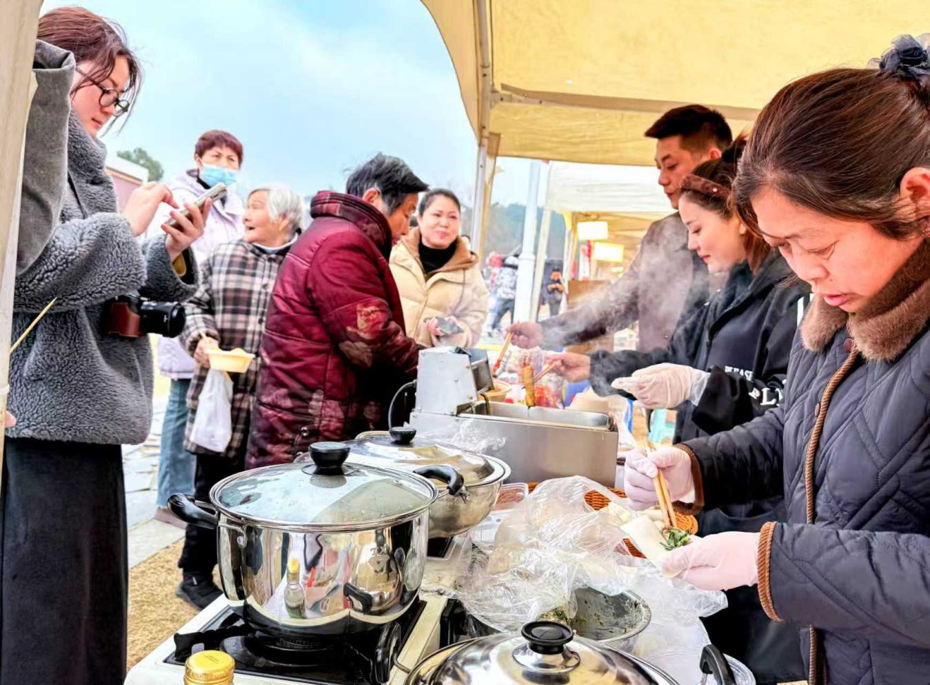 最具仪式感的莫过于“开油锅”区域。一口大铁锅内,热油翻滚,金黄的春卷与豆腐果在其中“滋滋”作响,升腾的蒸汽裹挟着扑鼻香气,瞬间将人们的记忆拉回童年。“就是这个味儿!外皮酥脆,馅料鲜香,跟我奶奶当年做的一模一样。”市民李玉娟品尝着刚出锅的春卷,眼中满是怀念。同期推出的“石山下春宴”套餐,将米糕、青团、米酒、新鲜猪肉与暖心的腊八粥、扎实的大肉面巧妙搭配,让游客在田园山水间,品尝到了一席地道的乡土团圆饭,纷纷感慨“吃出了久违的团圆味”。