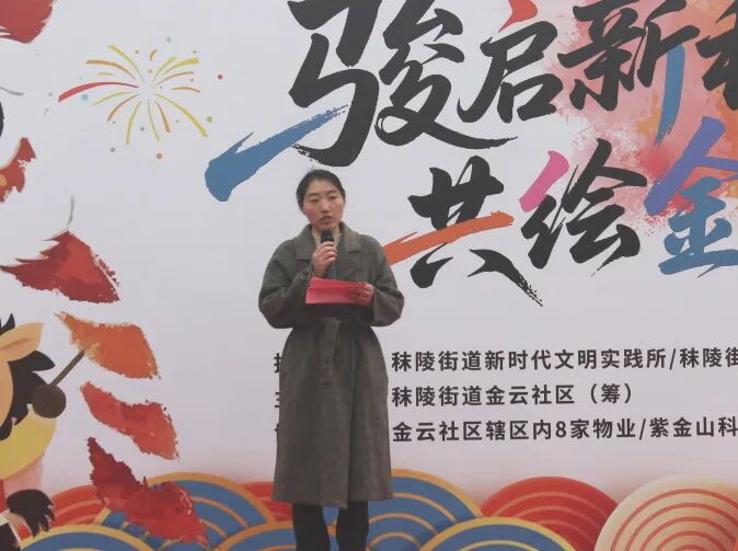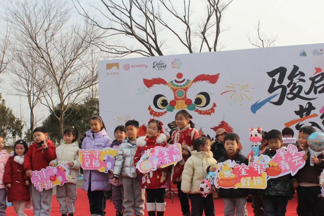 2月1日下午,上秦淮湿地公园会议中心秦淮舫西侧广场鼓乐喧天、人潮涌动。由秣陵街道新时代文明实践所、民生保障办公室(文体)指导,金云社区(筹)主办,辖区8家物业、紫金山科技城创新专列、环球少年学习成长中心协办的“骏启新程·共绘金云”新年睦邻文化节正式启幕。共建单位代表、党员和居民志愿者、新生儿家庭代表等百余名居民齐聚一堂,在民俗体验与文艺展演中,共同绘制一幅“邻里互助、友爱共生”的社区温情画卷。