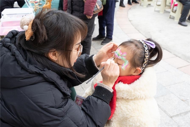 文艺汇演的余韵未散,非遗体验区早已人头攒动,面塑、糖画、草编、剪纸、吹糖人、面部彩绘、云锦布贴画七大非遗项目齐聚,让居民近距离感受传统技艺的魅力。非遗传承人巧手翻飞,一团团彩泥转眼变成栩栩如生的龙马造型,一勺勺糖稀在石板上勾勒出灵动的糖画,剪刀在彩纸间穿梭,一幅幅寓意吉祥的剪纸跃然纸上,吹糖人摊位前更是围满了孩子,看着糖稀变成可爱的小动物,满是惊喜。孩子们脸上绘着喜庆的图案,家长和孩子一同体验云锦布贴画,将传统美意融入指尖,非遗技艺在互动体验中得以传承,也让新春多了几分文化韵味。