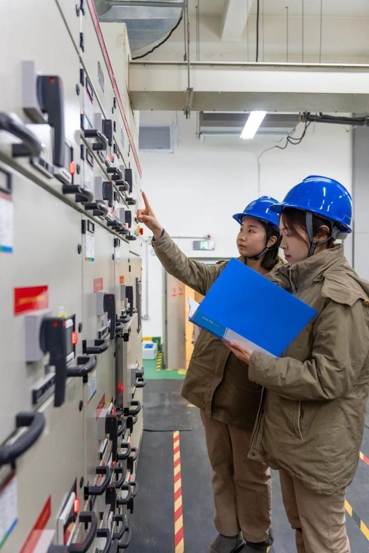 国网南京市江宁区供电公司营配管理部营销客户经理赵宁宁、唐嘉乐正在巡视商场配电房设备