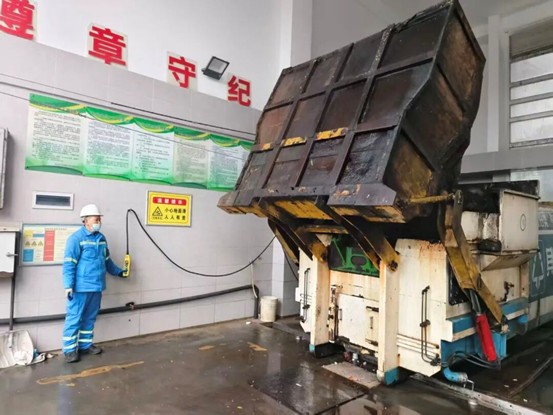 南京江护集团江宁东峻城市服务有限公司环卫工李荣林正在装卸和清理中转站垃圾,检查移动压缩箱体
