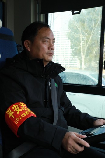 江宁公交汽车五队 836 路 “党员模范车” 驾驶员周贝洪正在运送出行居民