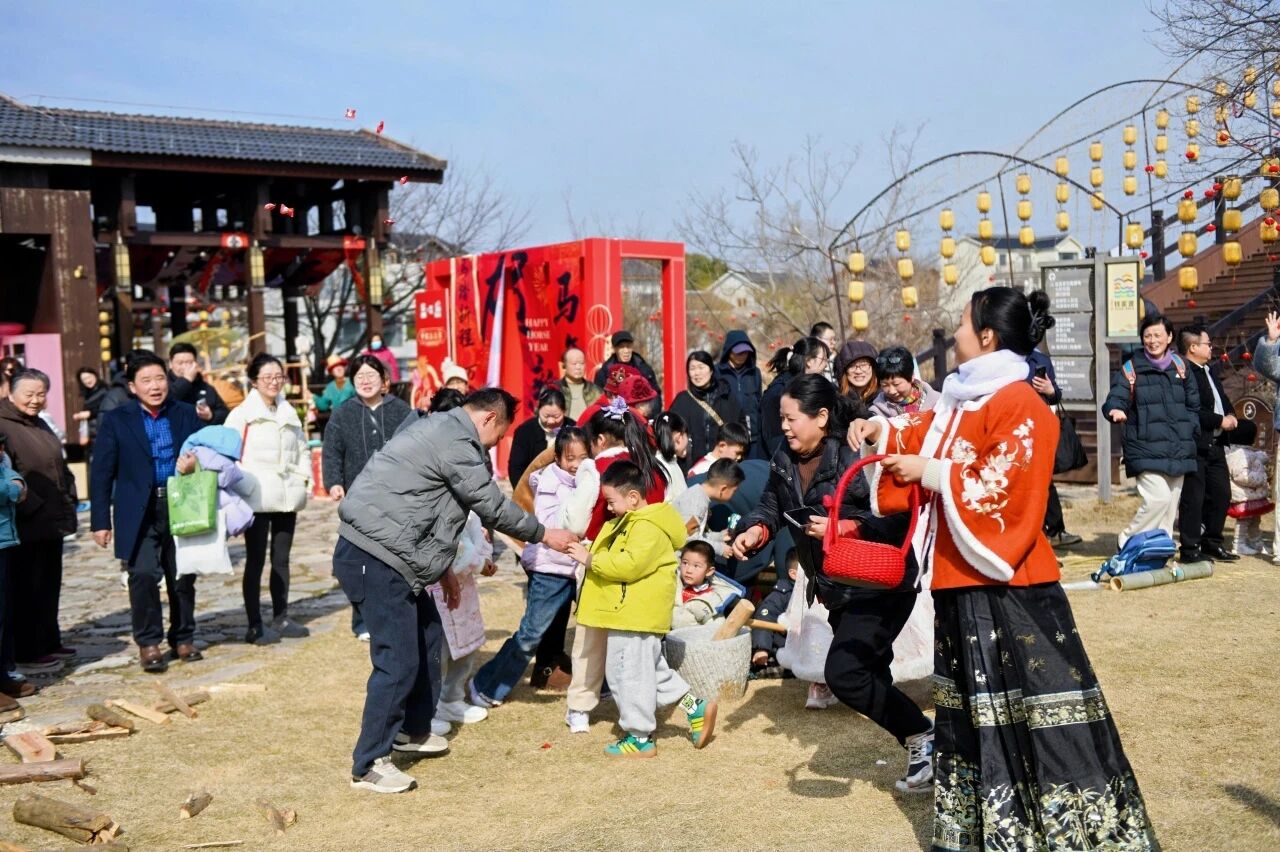 笔墨凝福,心愿迎新。现场写福字、春联、祈福牌,一字一句皆是平安顺遂的期盼。集章抽奖,为新的一年纳福启运,参加趣味投壶,还有机会赢精美小礼品。田园趣玩,迎新互动。除旧迎“薪”砍柴互动,寓意新年开好运、节节高;千槌迎新打糍粑,槌落有声、软糯香甜,在欢声笑语里感受最质朴的年俗乐趣。卖货郎走街串巷,推着小车,铃铛轻响、吆喝声声,满载文创小物与新春惊喜,一步一景重现江南水乡的传统年味。