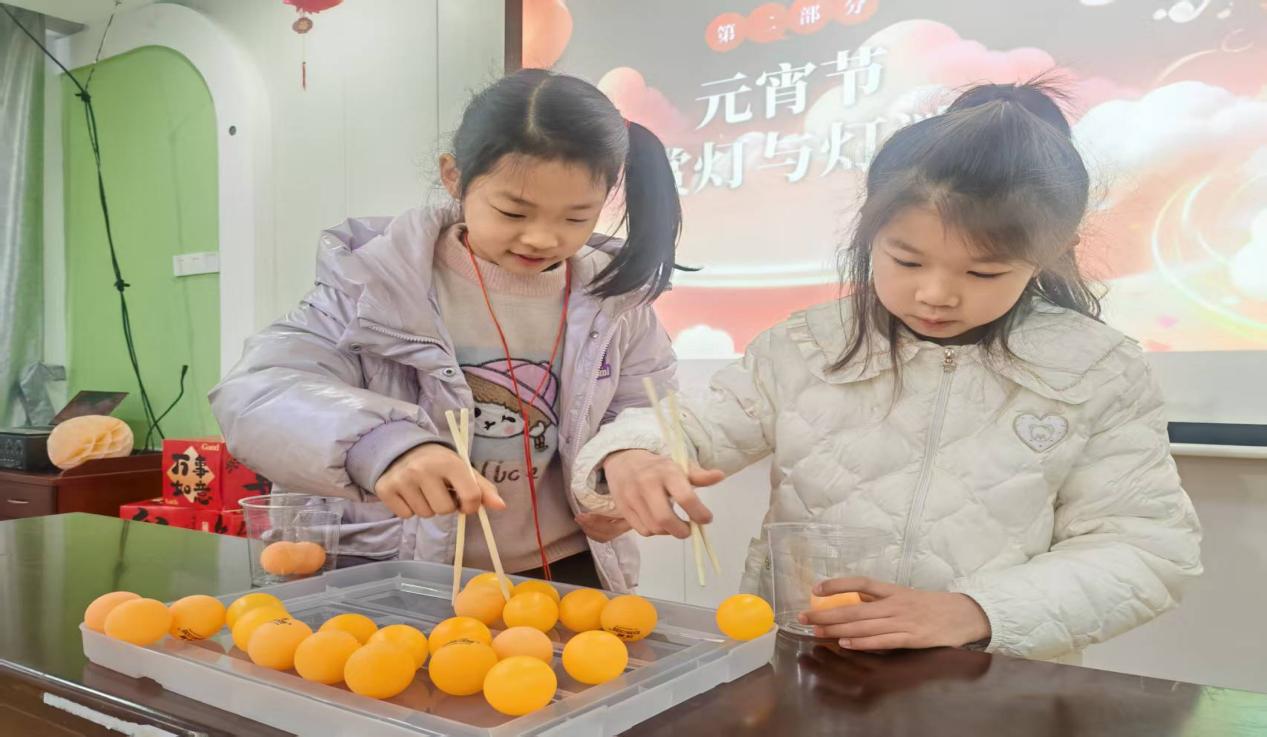相较以往,本次猜灯谜活动玩出了新花样!孩子们以小组为单位,通过“汤圆送福”趣味挑战赛赢取灯谜灯笼。赛场上,大家手持筷子屏气凝神,沉浸式的体验夹“汤圆”的乐趣。有的屡战屡败急得直跺脚,有的夹到半空遗憾滑落,有的则已战果累累。观众席上加油声、呐喊声此起彼伏,现场氛围热烈非凡。