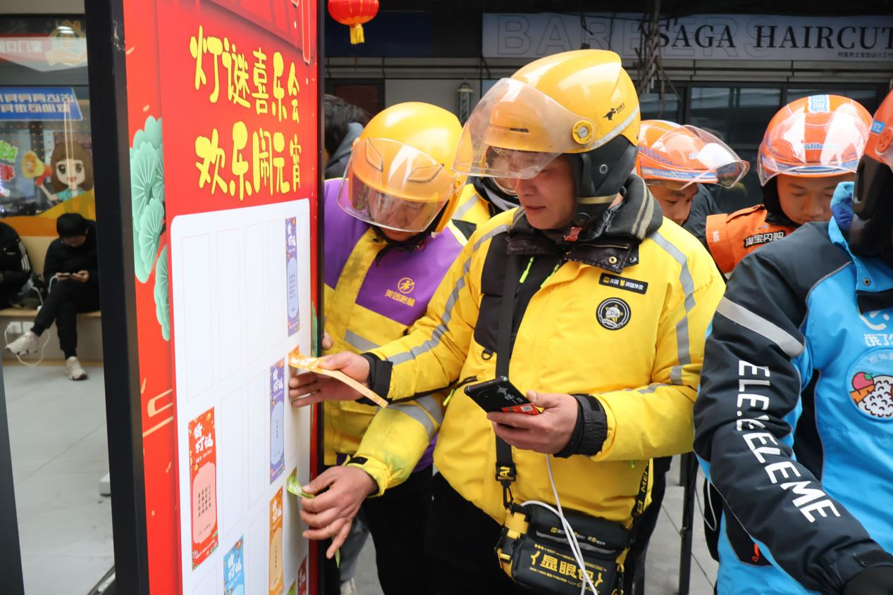 活动向常年坚守一线的外卖骑手致以节日问候与诚挚感谢。新区市场监管局、新区公安分局见义勇为基金会,分别为争先创优的骑手党员、参加见义勇为服务的困难家庭骑手送上慰问金,并为全体骑手发放暖心慰问品,让春日暖意直抵人心。现场互动精彩纷呈,融合节日习俗与安全知识的灯谜抢答将氛围推向高潮,骑手们踊跃参与,在欢乐中感受民俗魅力。一旁的便民服务区同步开启,就业指导、消防知识科普、车辆免费维修清洗等“一站式”服务,精准解决骑手日常难题。当热气腾腾的元宵送到手中,香甜的滋味与团圆的温馨在现场流淌,此刻的“小北・骑手微家”已然成为骑手们温暖安心的团圆港湾。