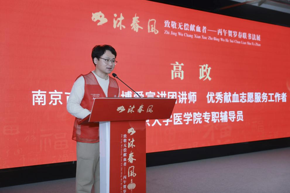 无偿献血者、无偿献血志愿服务者代表,南京大学医学院专职辅导员高政分享了自己与无偿献血的故事。专程从四川远道而来的书法家代表郭孝谦发表了激动人心的演讲,抒发了自己作为一名艺术工作者对于无偿献血事业的脉脉温情。