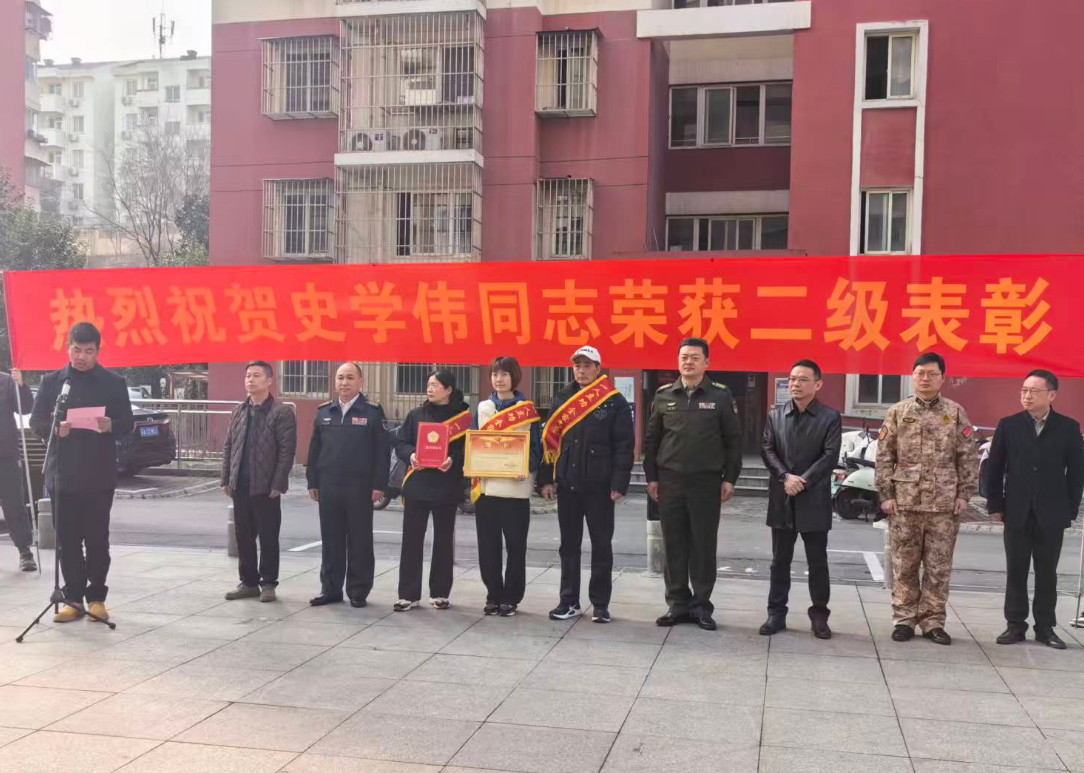 小区广场上,“热烈祝贺史学伟同志荣获二级表彰”的红色横幅格外醒目,铿锵的锣鼓声吸引了众多居民驻足围观。送喜报仪式由区退役军人事务局四级调研员阮延霖主持。活动现场,区退役军人事务局局长王宁宣读喜报,区人武部部长李军为史学伟家属发放立功奖状,燕子矶街道办事处主任程海博、人武部部长李峰为家属佩戴绶带,区委常委、人武部政委陈安邦向家属表示热烈祝贺,感谢他们为国家培养了好军人、为部队送去了好人才。