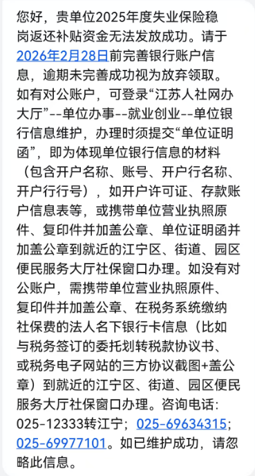工作人员查看短信内容后,告知宋先生完善银行账户信息后可以领取,并且如果现在提供营业执照、“委托划转税款协议书”(以下简称“三方协议”),当场就能在服务窗口维护单位银行信息。但宋先生表示缺少“三方协议”,计划第二天再来办理。然而,2025年度失业保险稳岗返还补贴资金发放,需要单位于2026年2月28日前完善银行账户信息,逾期未完善成功视为放弃领取。