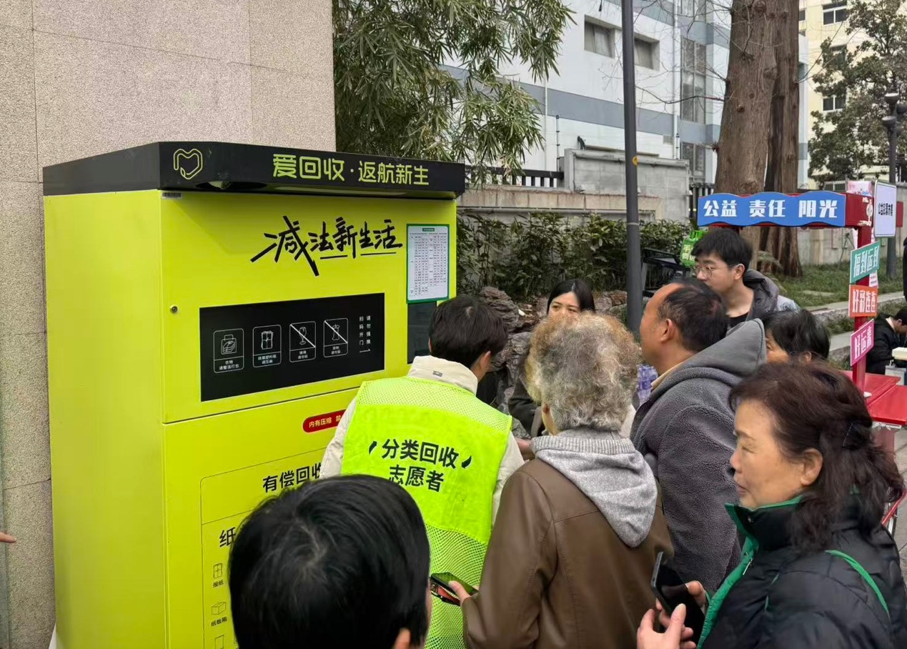 活动现场还展示了爱回收智能回收机,居民通过微信扫码投递,投递生活垃圾中的纸板、塑料瓶、衣物、金属等可回收物,并根据投递重量获取环保金奖励,微信内可直接提现。依托于爱回收·返航新生建立的“点-站-场”三级运营体系,居民投递的可回收物经过中转站暂存,最终被送至末端分拣工厂进行精细化处理。在分拣中心可回收物被细分为80个品类,直送有资质的再生资源企业进行回收再利用。正是通过这一完整的“回收-运输-处置”产业链闭环,成功实现了50%以上的可回收物与城市其他垃圾的有效分流,从源头上为城市垃圾减量。