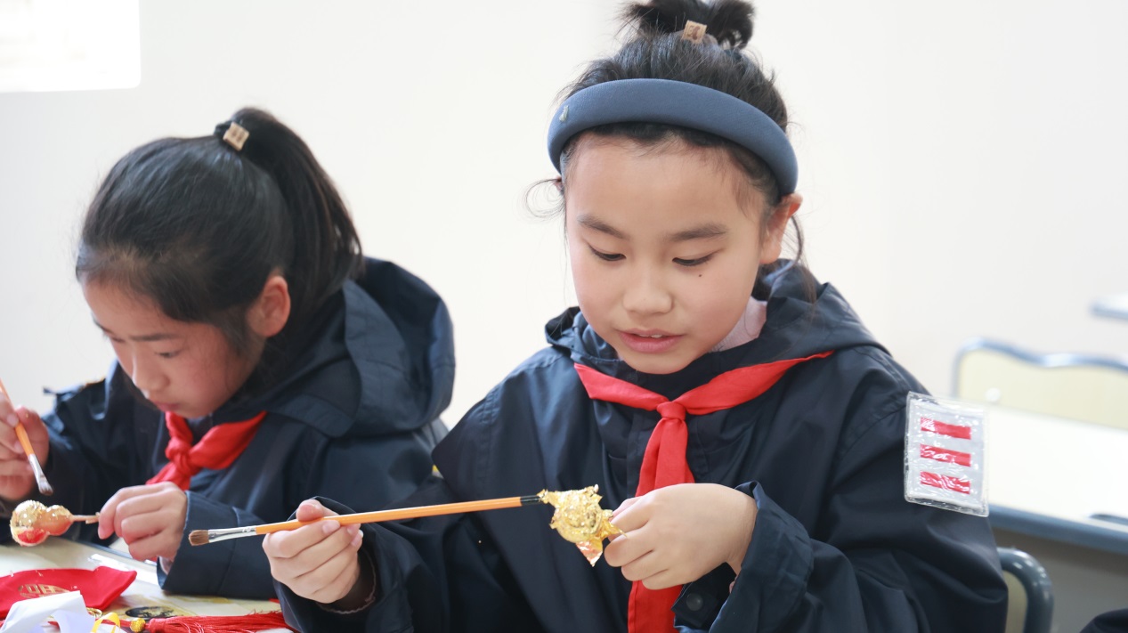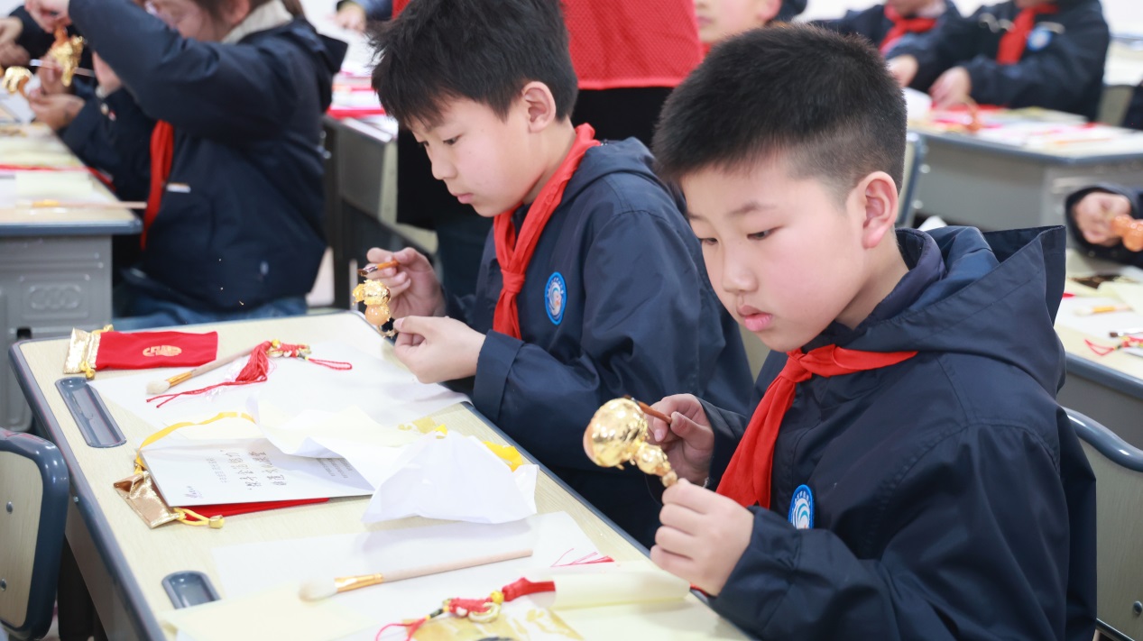 活动最后,金线金箔总厂的陈龙、孔思思老师带领同学们走进省非遗工坊,开展金箔贴金葫芦体验活动。老师们耐心讲解贴金技巧与注意事项,手把手指导操作。同学们结合美术课堂所学的构图与装饰知识,小心翼翼将金箔贴合在葫芦表面,用指尖感受金箔的轻薄质感,在动手创作中完成一件属于自己的非遗作品,看着原本素朴的葫芦披上璀璨金衣,脸上洋溢着创作的喜悦与满满的成就感。