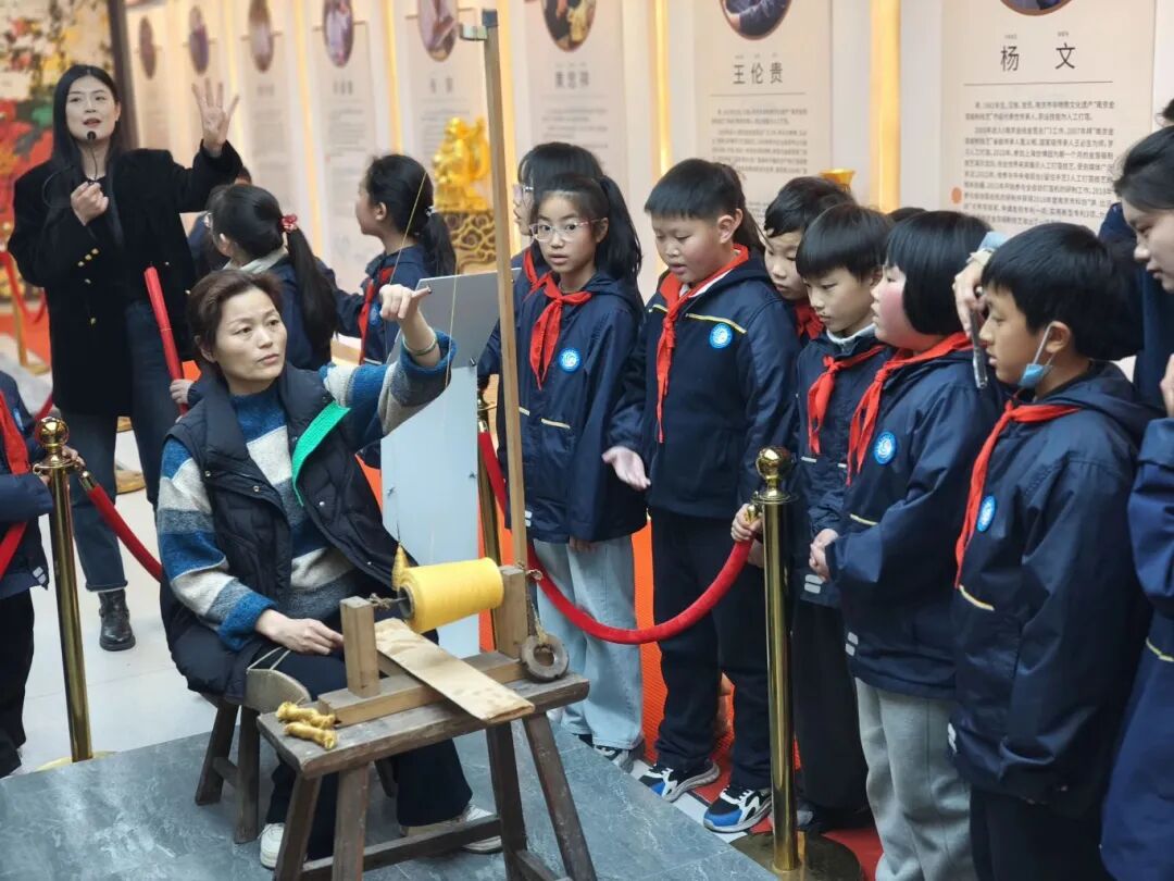 紧接着,同学们观摩了区级传承人王敬老师展示的搓金线传统工艺,古老的木质纺车缓缓转动,金黄丝线在指尖缠绕成型,看似简单的步骤却需要十足耐心与娴熟技巧,古老技艺的细腻与精巧,让孩子们近距离感受到非遗的独特魅力,围在一旁仔细观看,由衷赞叹传统工艺的神奇。此外,馆内陈列的金箔工艺品、文创作品同样令人驻足,从传统摆件到现代文创,金箔的应用在古今之间实现了完美衔接,让孩子们感受到非遗技艺的创新活力。