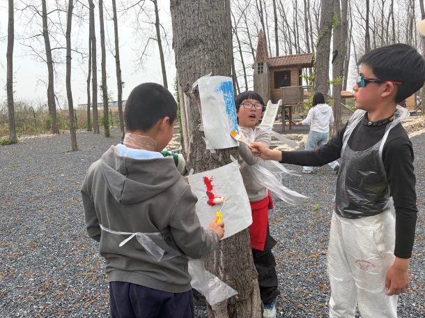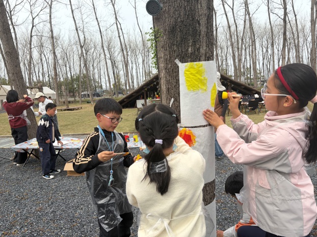 研学的尾声,是静心创作的美育时光。孩子们收集林间脱落的树皮,以之为画布,用颜料与干花点缀,创作独一无二的树皮纹理画。亲手装裱,将“水一方”的草木纹理与自然灵趣定格成可以带走的纪念。这一刻,艺术源于自然,美感生于实践,一场关于发现美、创造美的熏陶自然而然地完成。