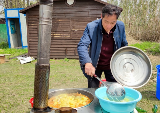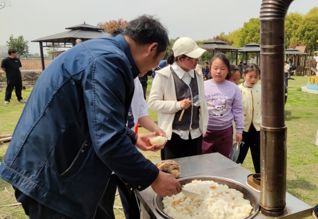走进龙潭水八鲜推广展示园,孩子们瞬间融入田园生活。在这里,大家认识了莲藕、茭白、荸荠、菱角、水芹、芡实、慈姑、芋头等龙潭特色“水八鲜”。在老师的组织下,孩子们参与趣味团队游戏,放松身心、增进默契;随后又体验钓龙虾,在静谧水乡中感受田园野趣。之后,孩子们跟着老师一起用“水八鲜”搭配龙潭特色“芳草渡”大米,学习生火、掌勺,制作大锅菜,合作烹制了三锅乡土风味。当热气腾腾的大锅菜出锅,那份源自土地、成于双手的鲜甜,是对“农耕艰辛”与“收获喜悦”最直接的启蒙,也是对脚下这片鱼米之乡最深情的认知。