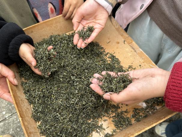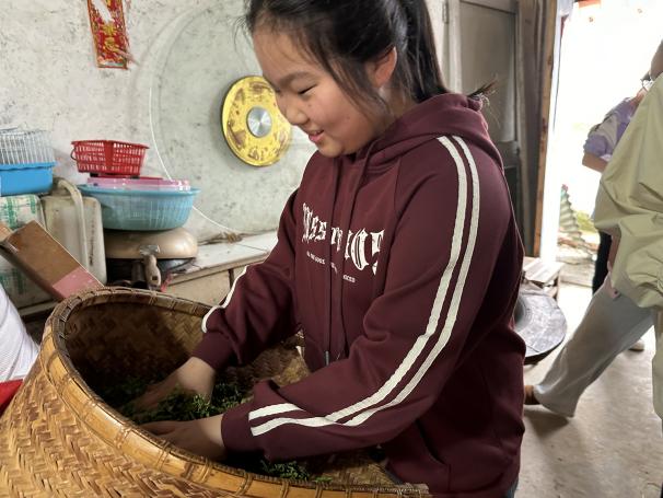 采摘结束后,亲子家庭来到村制茶工坊。非物质文化遗产代表性传承人现场演示杀青、揉捻、干燥等传统制茶工序,孩子们围在灶台前,好奇地观察茶叶在高温铁锅中的变化。“原来茶叶要经过这么多步骤才能变成我们喝的茶!”10岁的王同学惊叹道。在传承人手把手的指导下,孩子们小心翼翼地翻炒茶叶,感受着叶片从柔软到卷曲的奇妙过程,体会“匠心制茶”的不易。