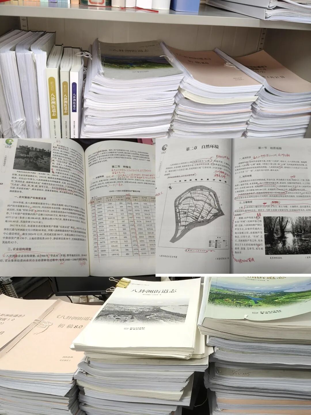 全书首版初稿完成时,篇幅逾50万字,甄选图片300余张。此后,志书进入了多轮打磨的修改完善阶段。栖霞区地方志工作办公室的专家多次亲临一线指导,从篇目架构的调整到行文表述的规范,从史实细节的核准到终稿内容的审定,全程严格把关、悉心指导。编纂团队逐字逐句研读、反复推敲打磨,全书累计完成系统性修改30余稿,打印成册的修改稿件堆叠高度超一人,纸页上密密麻麻的红笔批注,皆是修志人严谨治学的印记。正是这份近乎严苛的匠心与坚守,让这部志书真正具备了经得起历史与时间检验的底气。