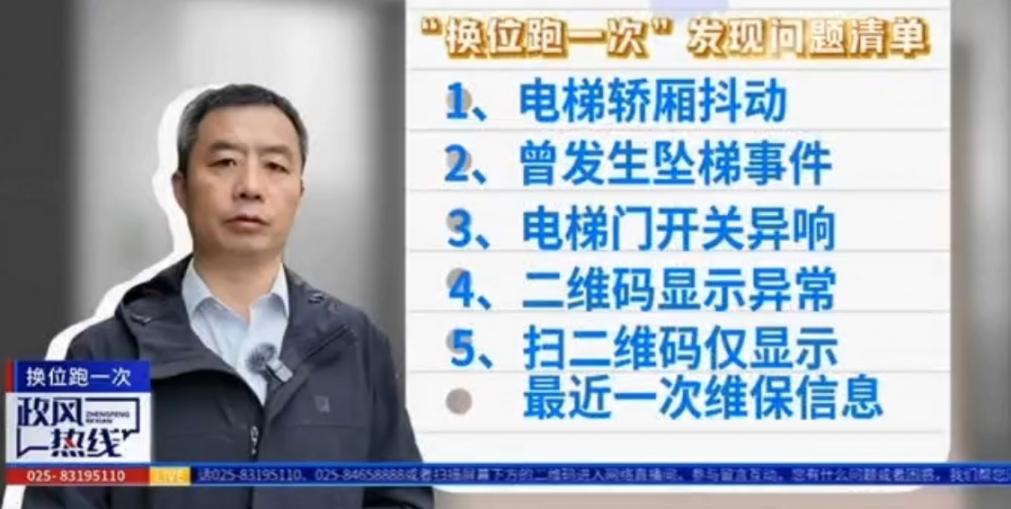 江苏省市场监管局特种设备安全监察处副处长许纲以普通业主身份,开展 “换位跑一次”暗访,现场查实该小区电梯存在五项突出安全隐患:1 号楼二单元 4 号电梯轿厢运行抖动明显,维保单位仅以调低运行速度作为临时应对,未从根源排查整治故障;曾发生坠梯险情的电梯已停用;部分电梯开关门异响严重;电梯使用标志二维码显示异常,仅可查询单次维保记录,安全公示内容残缺、标注不规范。经现场核实,维保单位单纯依靠调整运行参数缓解问题,未开展全面排查与彻底整改,维保工作流于形式。