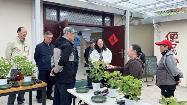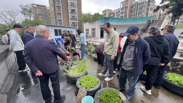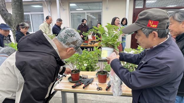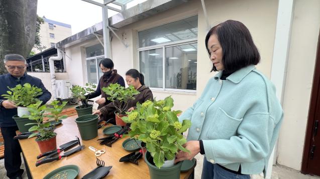 理论分享之后,活动进入最受期待的实践环节——“认养一方绿”。社区精心准备了绣球花苗、花盆以及小铲子等种植工具,每位参与居民均可认养一株属于自己的绣球花。工作人员现场指导居民动手栽种:装土、移苗、施肥、浇水……大家兴致勃勃地操作着,不一会儿,一盆盆生机盎然的绣球花便在居民手中安了家。同时,每盆绣球花附赠一份“养生植物养护小贴士”,清晰标注光照需求、浇水频率、修剪要点以及绣球花在观赏疗愈方面的作用——“养护绣球的过程本身就是一种减压方式,能让人静心养性”。居民们捧着自己亲手栽种的绣球花,脸上洋溢着成就感与责任感。这一环节将阅读所得知识转化为亲手实践,实现了“阅读—认养—应用”的完整闭环。