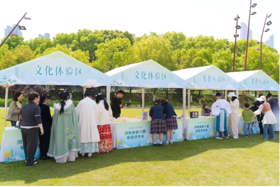 主仪式落幕,草坪多元互动体验区热闹开启。20 顶主题阅读帐篷错落排布,涵盖经典名著、绘本故事、红色阅读、科普知识四大区域,阅读引导员带领亲子家庭共读分享,打卡即可兑换文创好礼。书香互动区里,“书名飞花令”“书籍大侦探” 趣味十足,市民踊跃参与,在游戏中检验阅读积累;文化体验区中,非遗活字印刷体验吸引大小朋友亲手印制经典诗词,创意书签 DIY 让灵感跃然纸上。此外,金融书香区反诈课堂、广电智慧区 AI 体验,让科技与阅读碰撞出别样火花。
