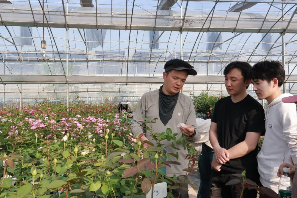 离开江堤,同学们走进月季园、百合园和菊花园。月季园花色正盛,花田边竖着实验标牌,滴灌管道整齐排布。“我们主要是和高校科研院所合作,做花卉新品种的选育和驯化,部分品种市面上并不常见。”基地老师捧起一株百合幼苗介绍。同学们蹲在田垄边,观察百合生长状态,他们了解到,鲜切花、食用百合、观光农业,一朵花可以延伸出多维产业方向。同学们围绕品类差异、培育过程与基地老师交流,“高校合作基地把品种的技术和市场连起来了,这是科技赋能农业的现实支点。”一名同学在笔记本上记录道。