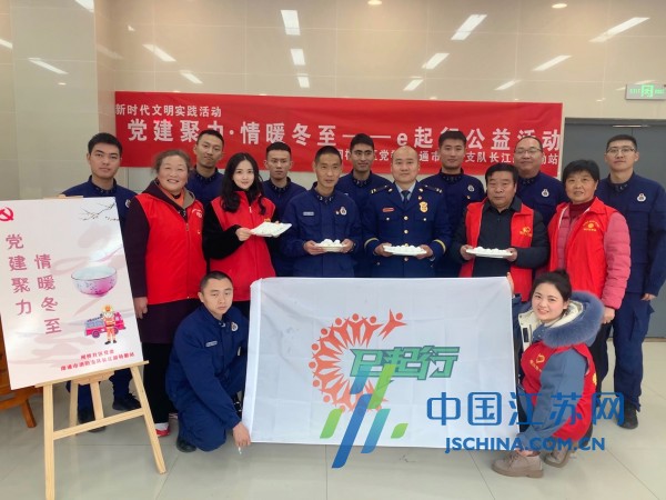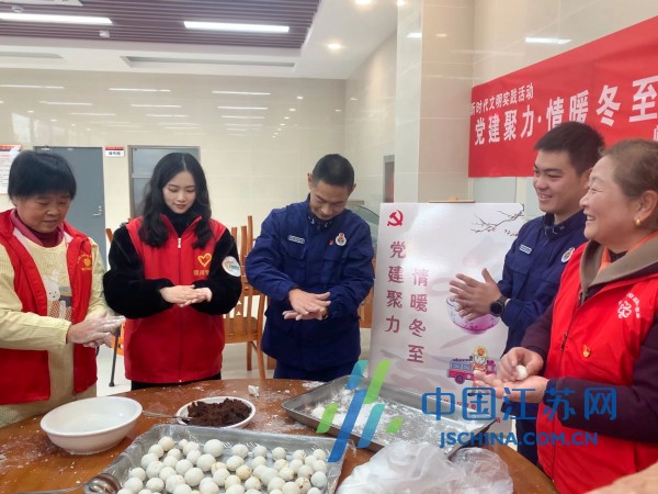 中国江苏网12月22日南通讯 日前,南通市崇川区狼山镇街道闸桥社区组织党员志愿者走进南通市消防支队长江路特勤站开展“党建聚力,情暖冬至”主题党日活动,党员志愿者与消防员们一同搓汤圆,以“志愿红”致敬“火焰蓝”。