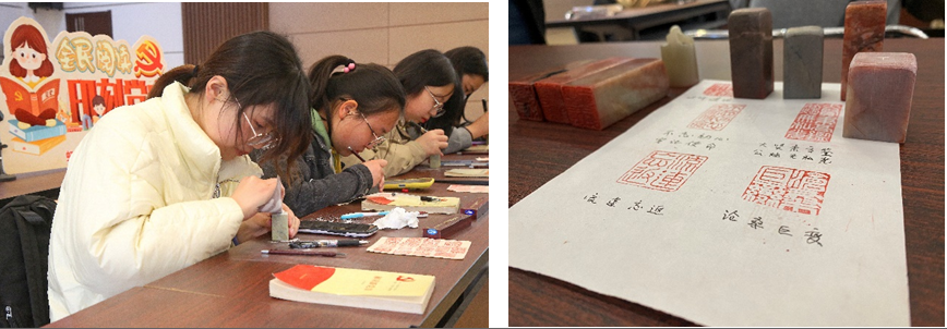 “这枚‘不忘初心’的印章是刻给我老伴的,她是一名党龄30年的老党员,我想让她随时记住自己的入党初心,为党为人民服务。”虹桥社区活动室内,刻印爱好者黄铁生正在为一群00后传授刻印技术,他老伴崔庆云正是虹桥社区惠馨邻里党支部的支委。“古人篆刻思离群,如今篆刻铭党史。”来自南通科技职业学院环境与生物工程学院的00后们认真地聆听党史,并刻下“沧桑巨变”“天道酬勤”……等篆刻作品。此次活动,社区党委把党史学习教育与全民阅读相结合,通过老党员讲解百年党史,号召当代大学生要爱党、敬党,积极向党组织靠拢。随后,黄老拿出工具和石料,教大学生刻印“沧桑巨变”四个字,他将手法和流程详细得教给大家,鼓励大家多练多学多想。00后们纷纷学党史与传承中华传统文化相结合,是一次奇妙的“旅程”。