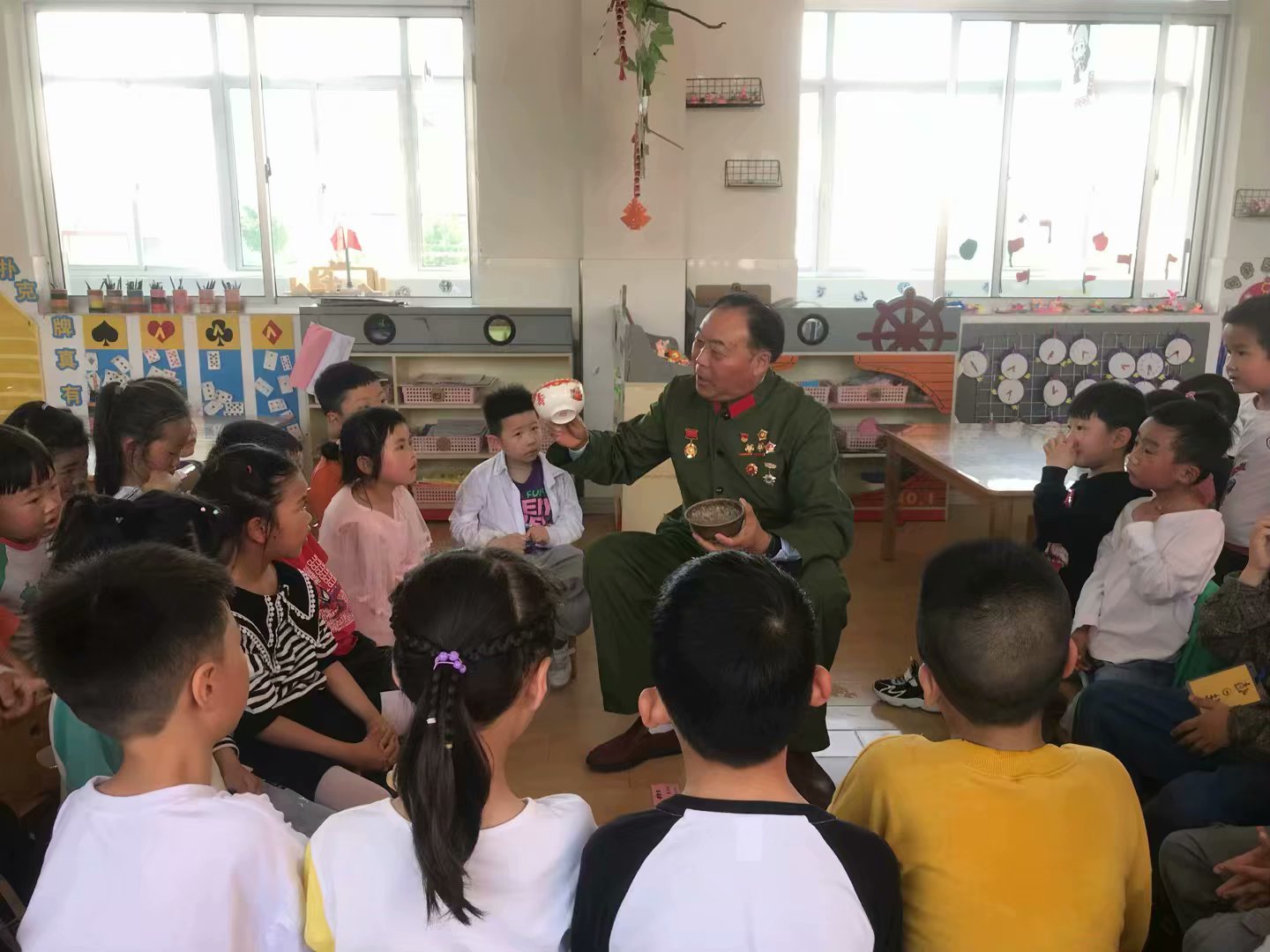 “一定要跟共产党走,因为共产党是只有一条被子也要分给你一半的好人。”立发幼儿园定期邀请老干部、老党员、老红军来园,他们亲切地与孩子们围坐在一起,为孩子们讲经典的红色故事:《江姐》《半条被子的故事》《碗的故事》等等,故事情节跌宕起伏、激励人心,孩子们听得认真、仔细。老同志们带来了一些有时代印记的物品,一个老物件代表一段回忆,打捞年深日久的陈年往事,真实地诉说着往昔岁月,见证某一段珍贵时光。孩子们好奇地围着老式电话、子弹盒、煤油灯、搪瓷碗等物品,表现出对历史的浓浓兴趣,兴国强国的理想在心田扎根。