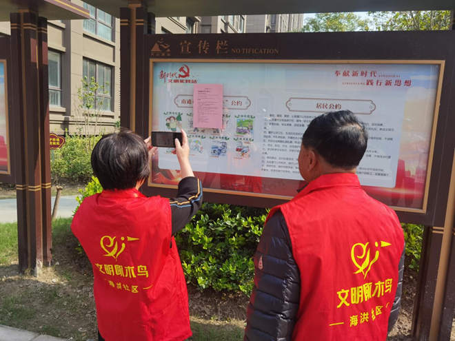 甘当平安环境建设者。海洪社区党委注重发挥老干部的独特优势,积极挖掘离退休老干部,组建老干部参与的“文明啄木鸟”市民观察团,助推社区治理。老干部们充分发挥自身工作经验丰富、威望高的优势,积极参与基层治理、公益帮扶等工作。退休老干部身穿“志愿红”,不辞辛劳地穿梭在小区的各个角落,调节邻里矛盾、清理楼道杂物堆放、检查小区安全隐患……老干部们发挥自身优势,碰到矛盾纠纷,主动当起“和事佬”,热心为居民排忧解难;发现社区“六乱”等不文明现象,老干部“随手拍”,督促物业解决问题,为社区治理注入“银发力量”,守护邻里安全。